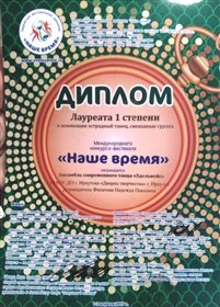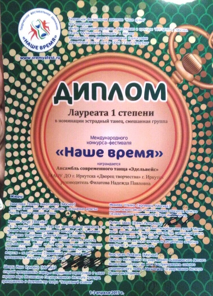 Поздравляем коллектив танцевальной школы "Эдельвейс" под руководством Филатовой Надежды Павловны, ставший лауреатом 1 степени в международном конкурсе-фестивале "Наше время" в г. Новосибирске.