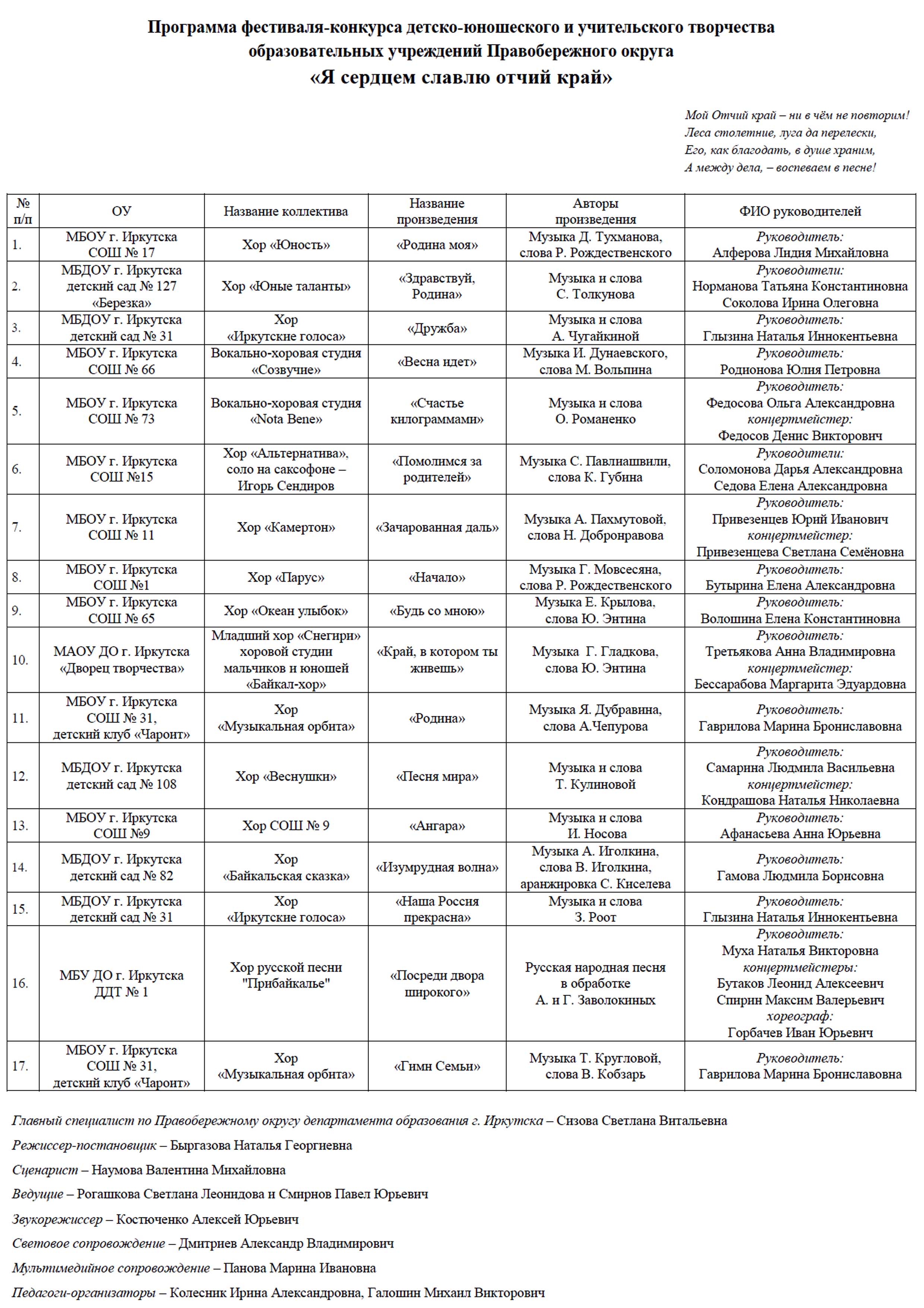 Спасибо всем, большим и маленьким, участникам фестиваля за ваш труд, за ваш искрометный талант, особое спасибо руководителям коллективов, педагогам, которые не побоялись выйти на сцену. Мы гордимся вами, мы очень любим вас!