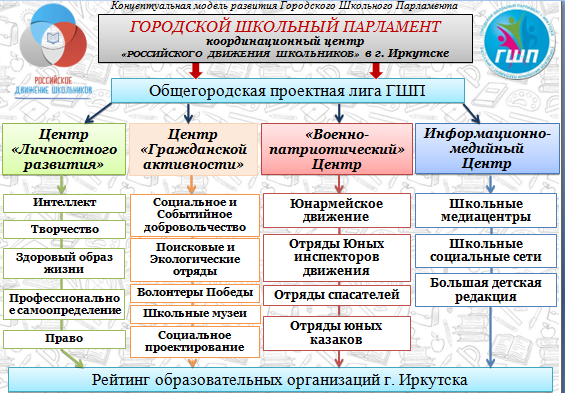 Итогом образовательной программы сессии стало утверждение новой, усовершенствованной структуры «Городского Школьного Парламента» (координационного центра «Российского движения школьников «в г. Иркутске).
