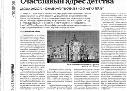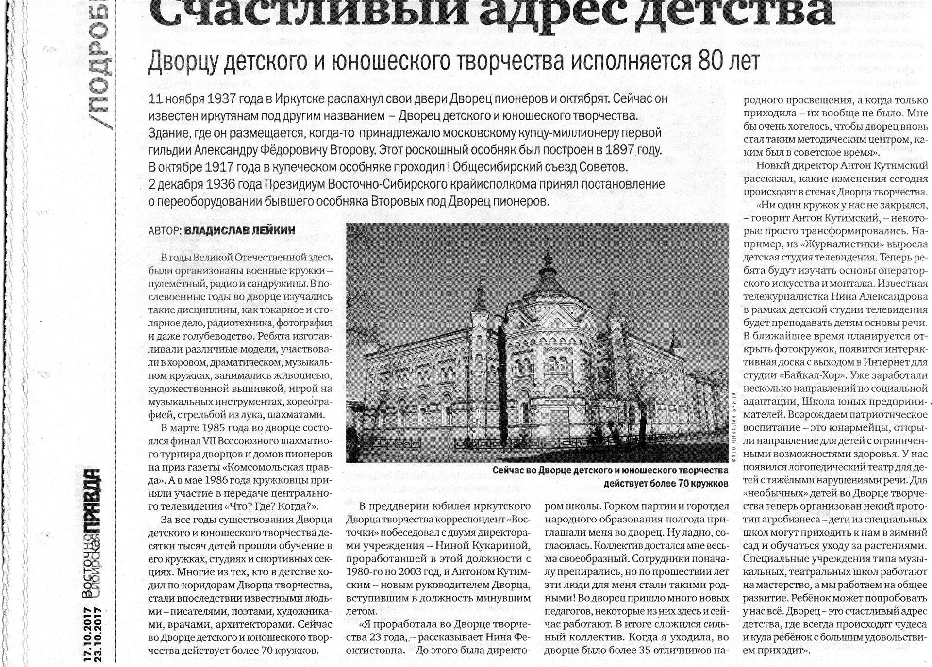 В преддверии юбилейных торжеств, корреспонденты Восточно-Сибирской правды взяли интервью у Кукариной Н.Ф. – директора Дворца творчества (1980-2003г.г.) и у Кутимского А.М. – нового руководителя Дворца.
