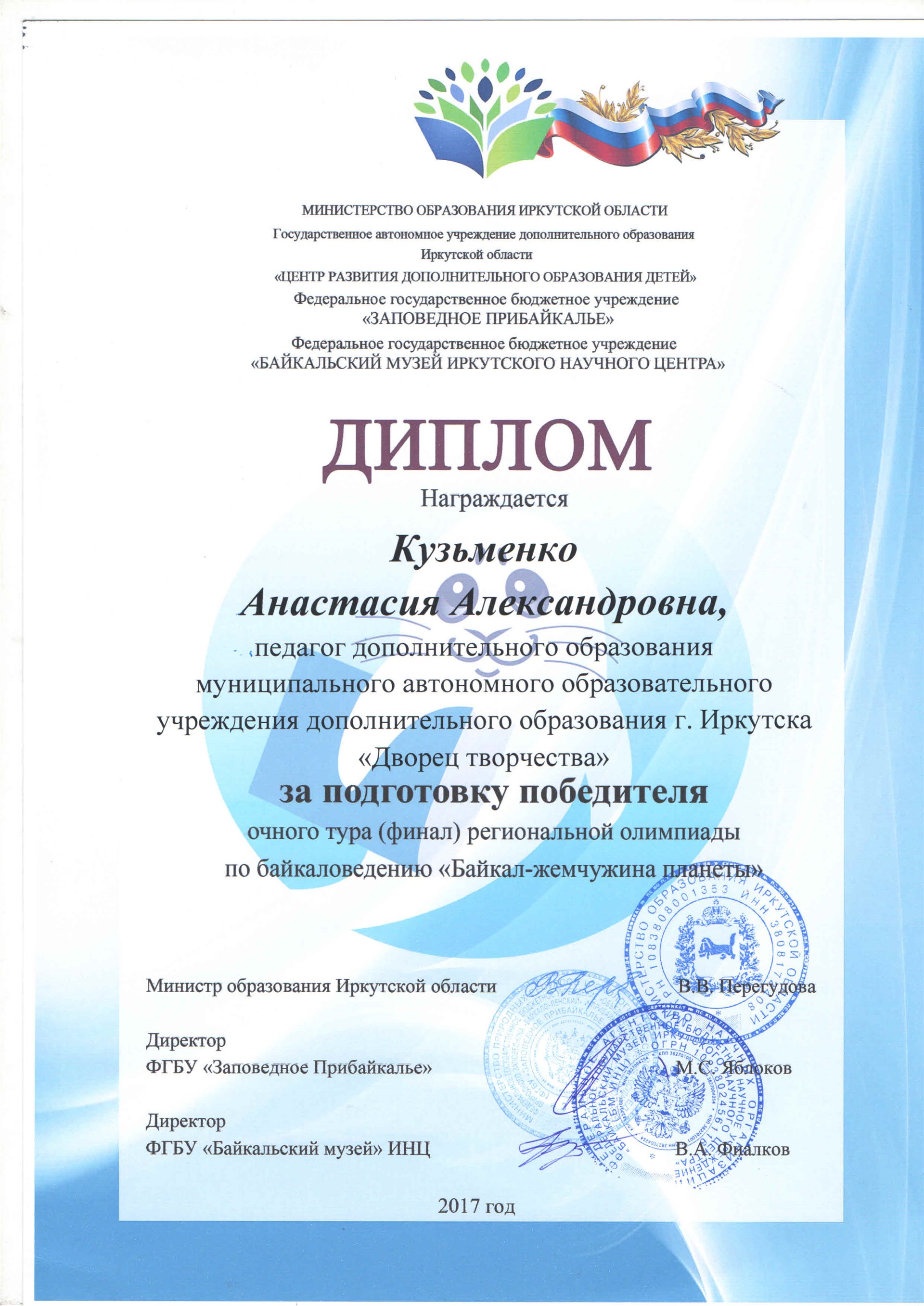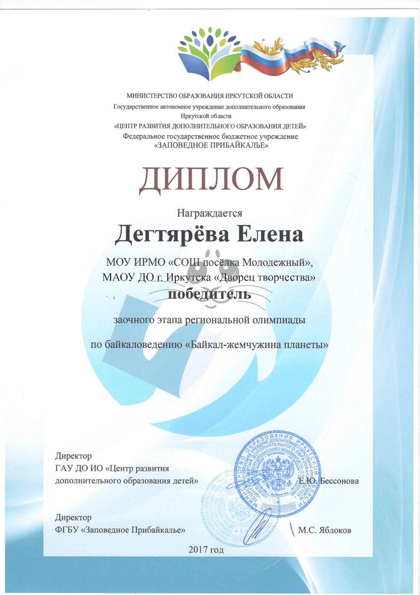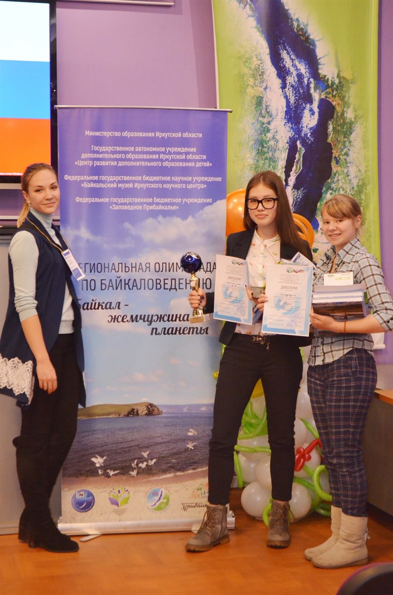 С 30 октября по 1 ноября 2017 года в п. Листвянка прошла региональная олимпиада по байкаловедению "Байкал – жемчужина планеты". В финал олимпиады по итогам двух туров вышли 8 обучающихся из образовательных организаций Иркутской области. В число финалистов вошли обучающиеся средней школы п. Молодежный и "Дворца творчества" г. Иркутска. Во время проведения олимпиады юные байкаловеды смогли не только проверить свои знания, но и увлекательно и познавательно провести свое время в Байкальском музее. Во время проведения экскурсии по музею финалистам олимпиады представилась возможность изучить тайны Байкала под микроскопом и, даже погрузиться на дно великого озера. Участники олимпиады высказали свою обеспокоенность экологическим состоянием Байкала и на деле при помощи создания и защиты экологических проектов по названием "Чистый берег" доказали это. По итогам олимпиады в число победителей и призеров вошли: Бричагина Алина, завоевавшая кубок за 1 место и Дегтярева Елена, занявшая 2 место. Алина и Елена, обучающиеся студии "Зеленый пазл" "Дворца творчества" г. Иркутска и СОШ п. Молодежный. Руководитель – педагог дополнительного образования МАОУ ДО г. Иркутска «Дворец творчества» Кузьменко А.А..