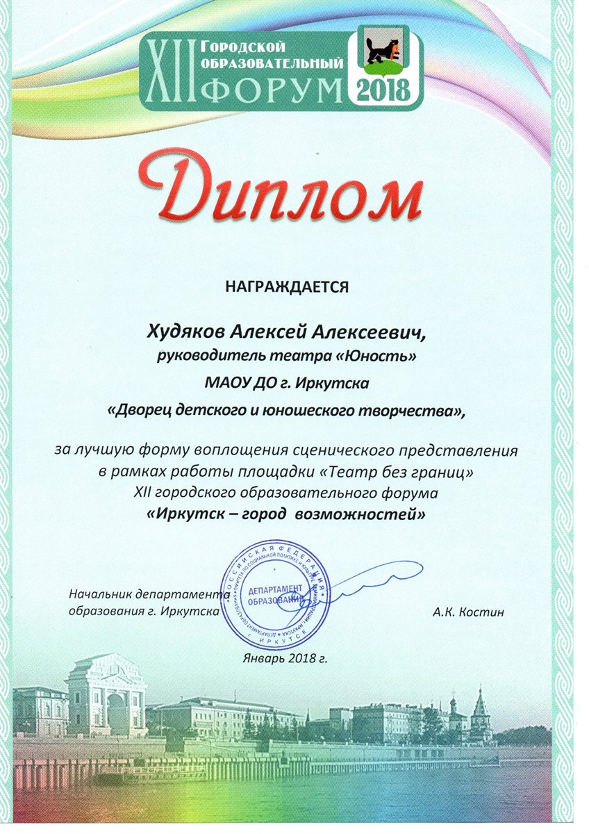 В рамках форума на базе Дворца творчества прошла секция "Театр без границ", в которой наш педагог, заслуженный деятель культуры РФ Алексей Алексеевич Худяков, получил диплом "За лучшую форму воплощения сценического представления".