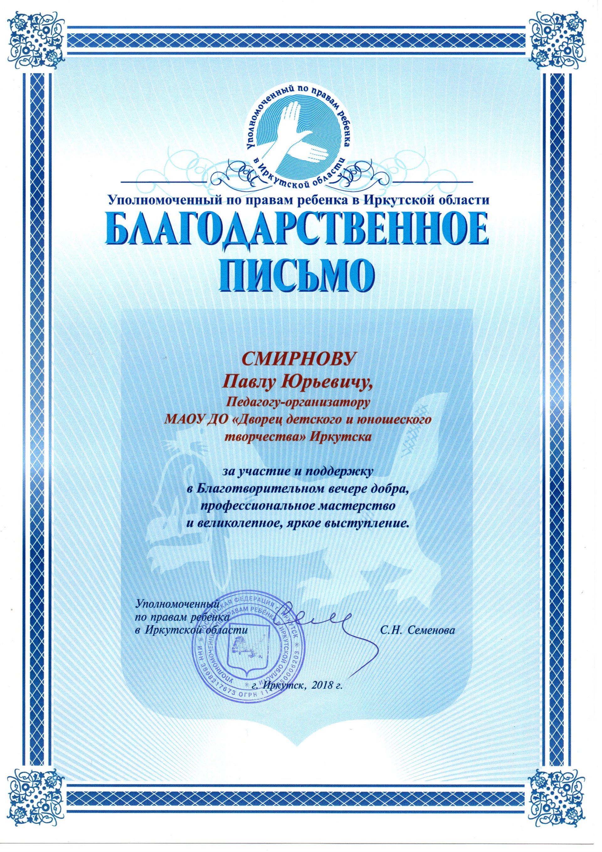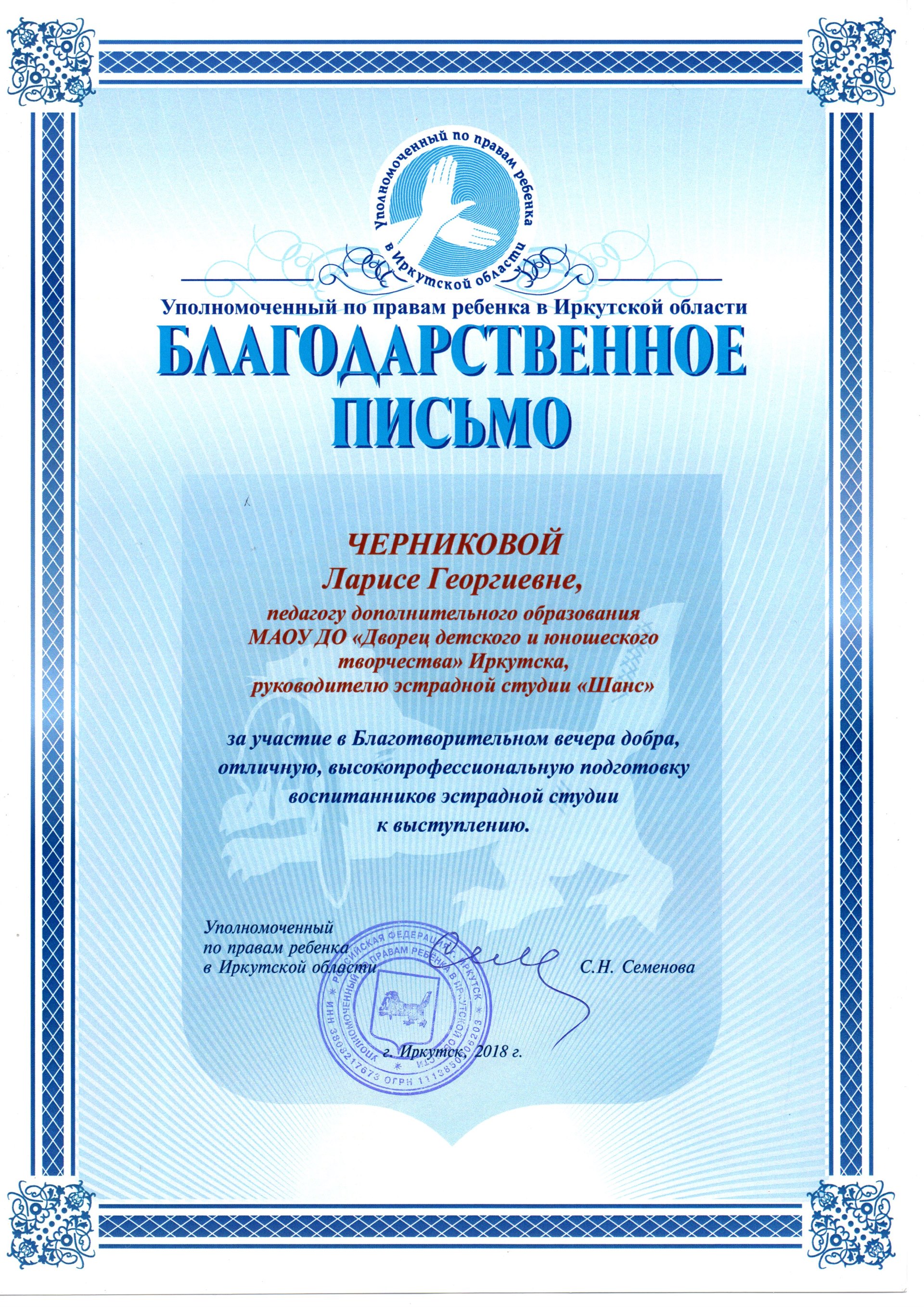 29 января 2018 года в Музыкальном театре имени Н.М. Загурского прошел Благотворительный вечер добра. Его организаторами стали Правительство Иркутской области, Управление Федеральной службы судебных приставов по Иркутской области, Уполномоченный по правам ребенка в Иркутской области, Областной совет женщин.
