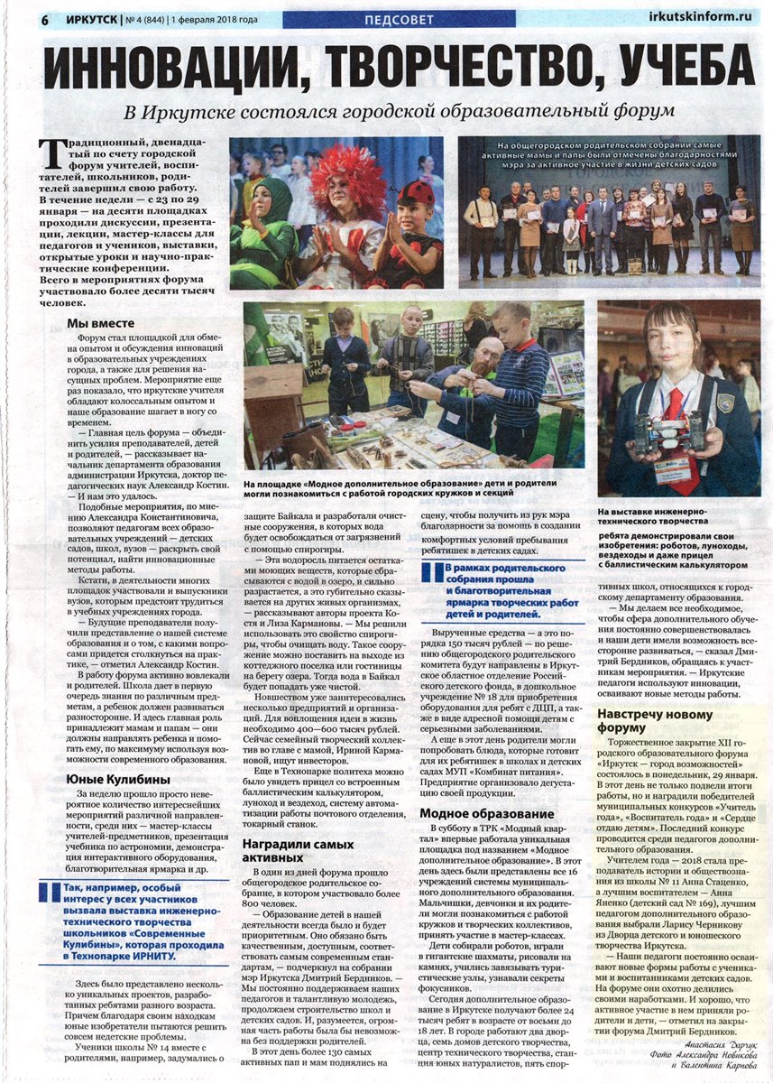 Торжественное закрытие XII городского образовательного форума «Иркутск — город возможностей» состоялось в понедельник, 29 января. В этот день не только подвели итоги работы, но и наградили победителей муниципальных конкурсов «Учитель года», «Воспитатель года» и «Сердце отдаю детям». Последний конкурс проводится среди педагогов дополнительного образования.