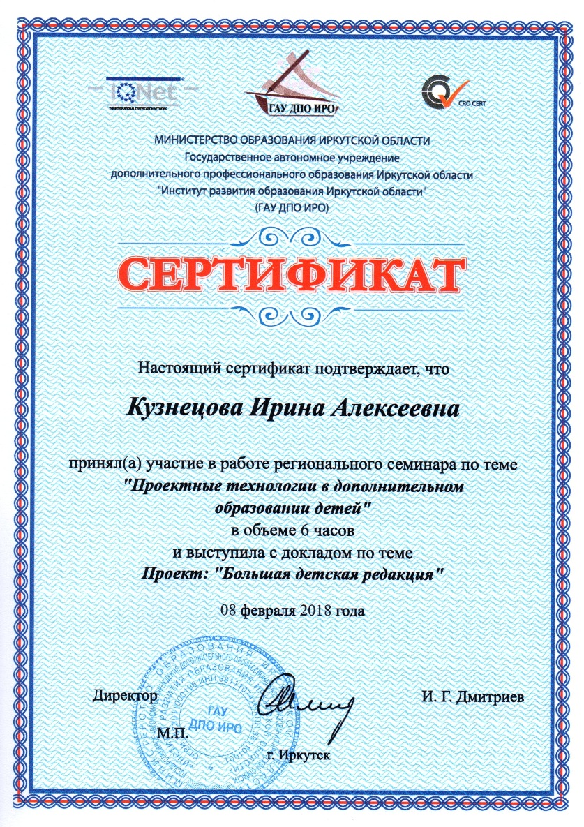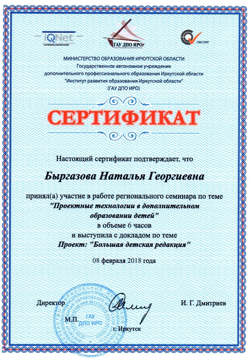 Сегодня, 8 февраля 2018 г., в ГАУ ДПО ИРО состоялся флеш-семинар «Проектные технологии в дополнительном образовании детей», в котором приняли участие сотрудники МАОУ ДО г. Иркутска «Дворец творчества». Майкова О. О., к.б.н., педагог дополнительного образования, представила доклад «Научно-исследовательская деятельность: от увлечения до профессии». Презентацию инновационного проекта «Большая детская редакция» Городского школьного парламента, представили: старший методист Быргазова Н.Г., педагог-организатор Кузнецова И.А. Всем участникам вручены сертификаты.