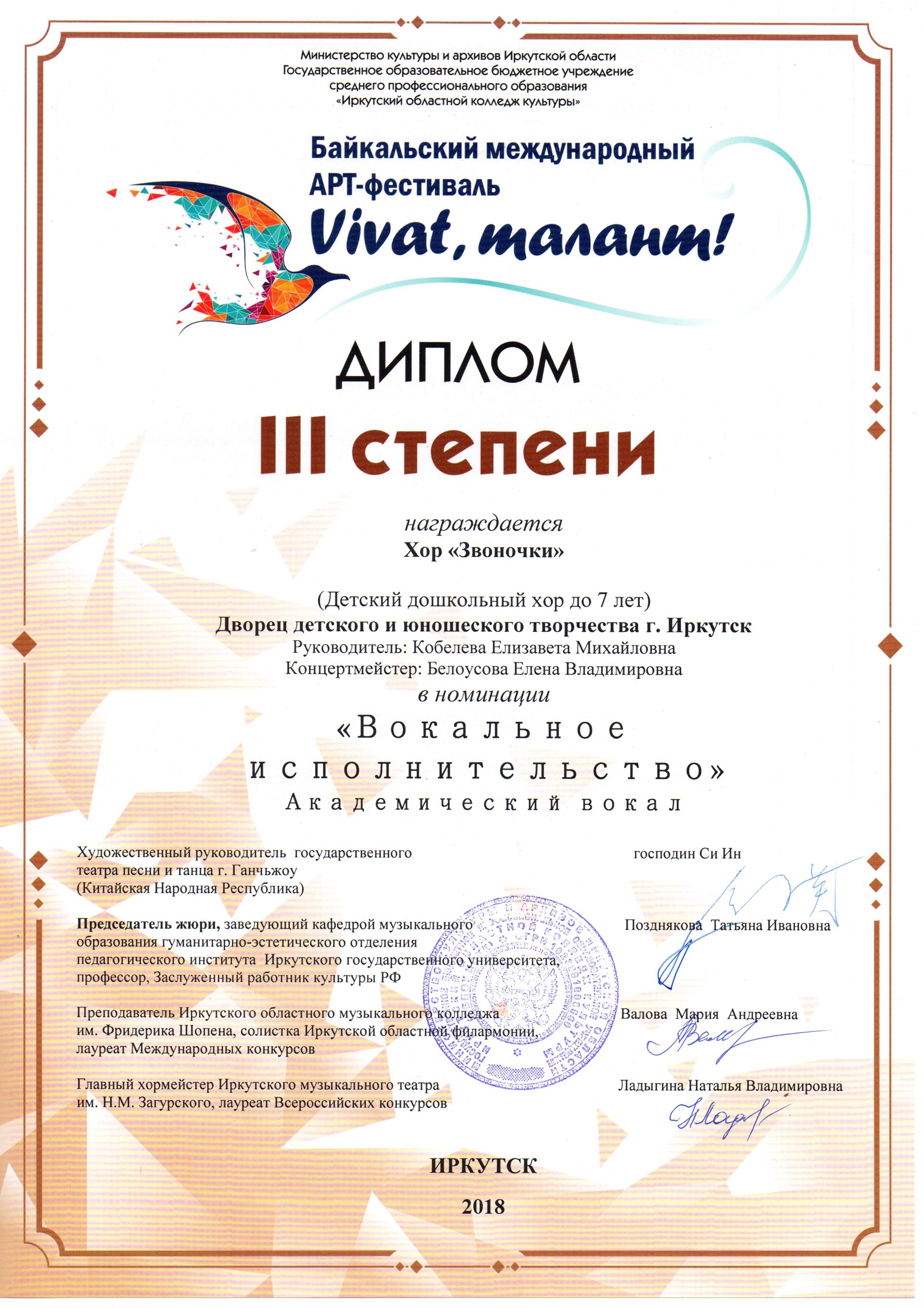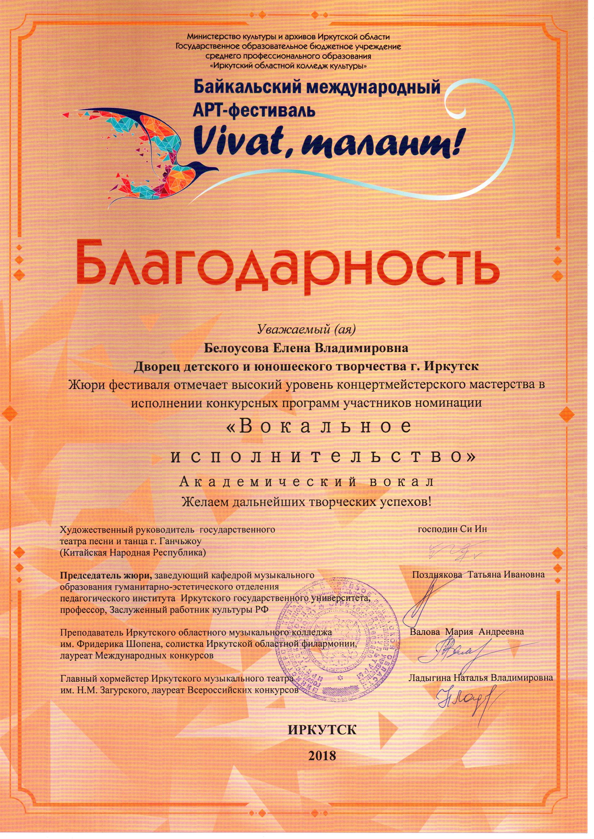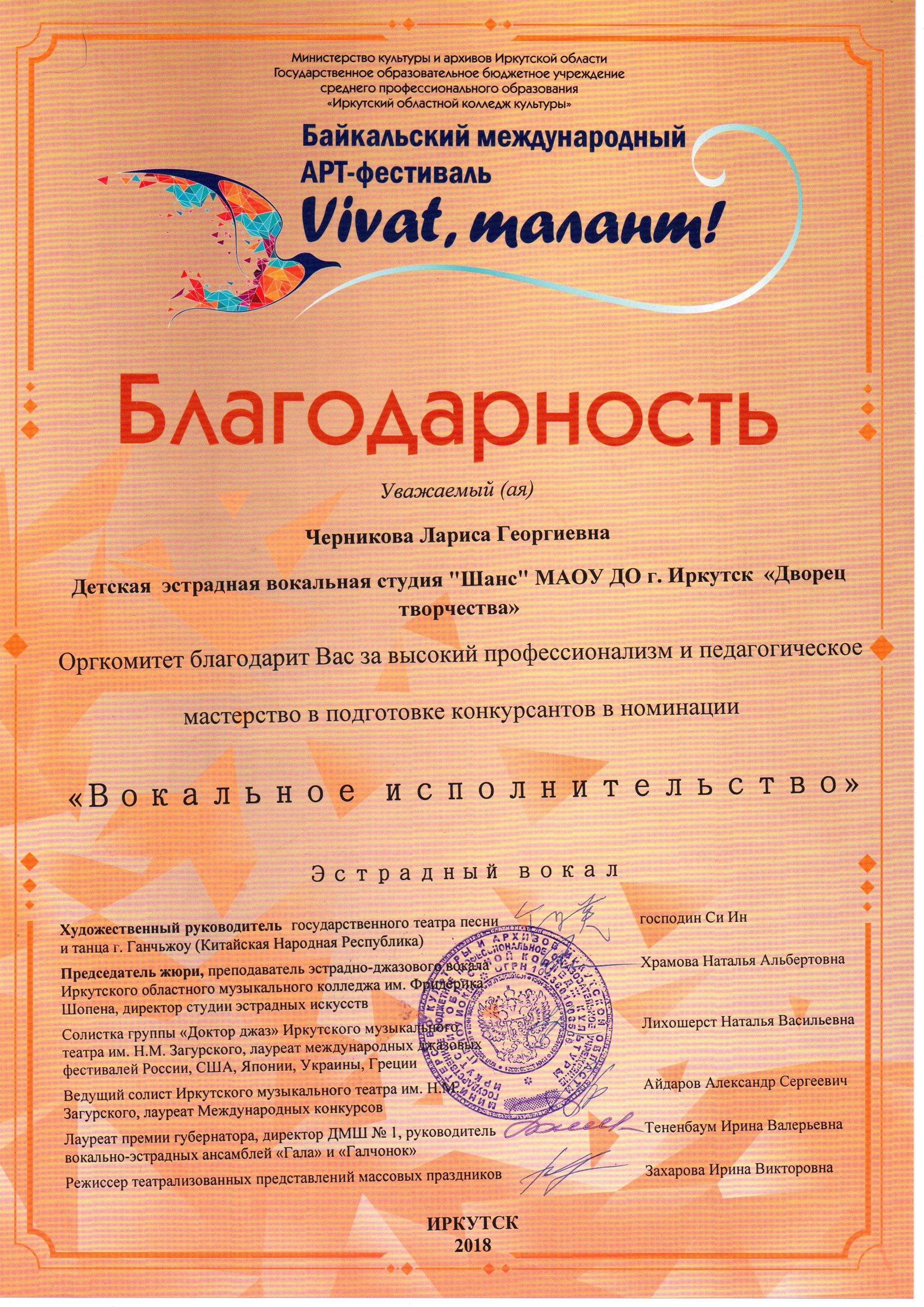 16 февраля в Иркутске стартовал первый международный ART-фестиваль «Vivat, талант! ». Участие в нем приняли более 3480 человек. На фестиваль поступило более 700 заявок из всех муниципальных образований Иркутской области, Республик Саха (Якутия) и Бурятия, Забайкальского края. Участие приняли коллективы из Китайской Народной Республики, а также студенты из Индонезии, Монголии и Республики Конго, которые учатся в России.
