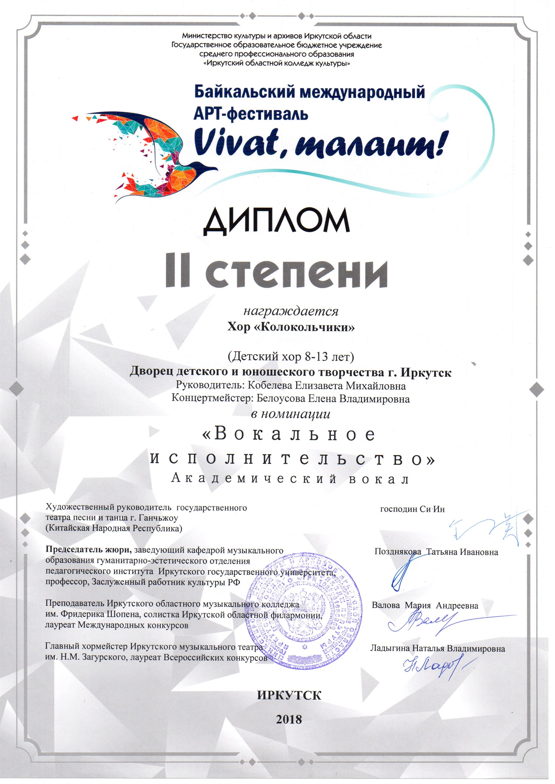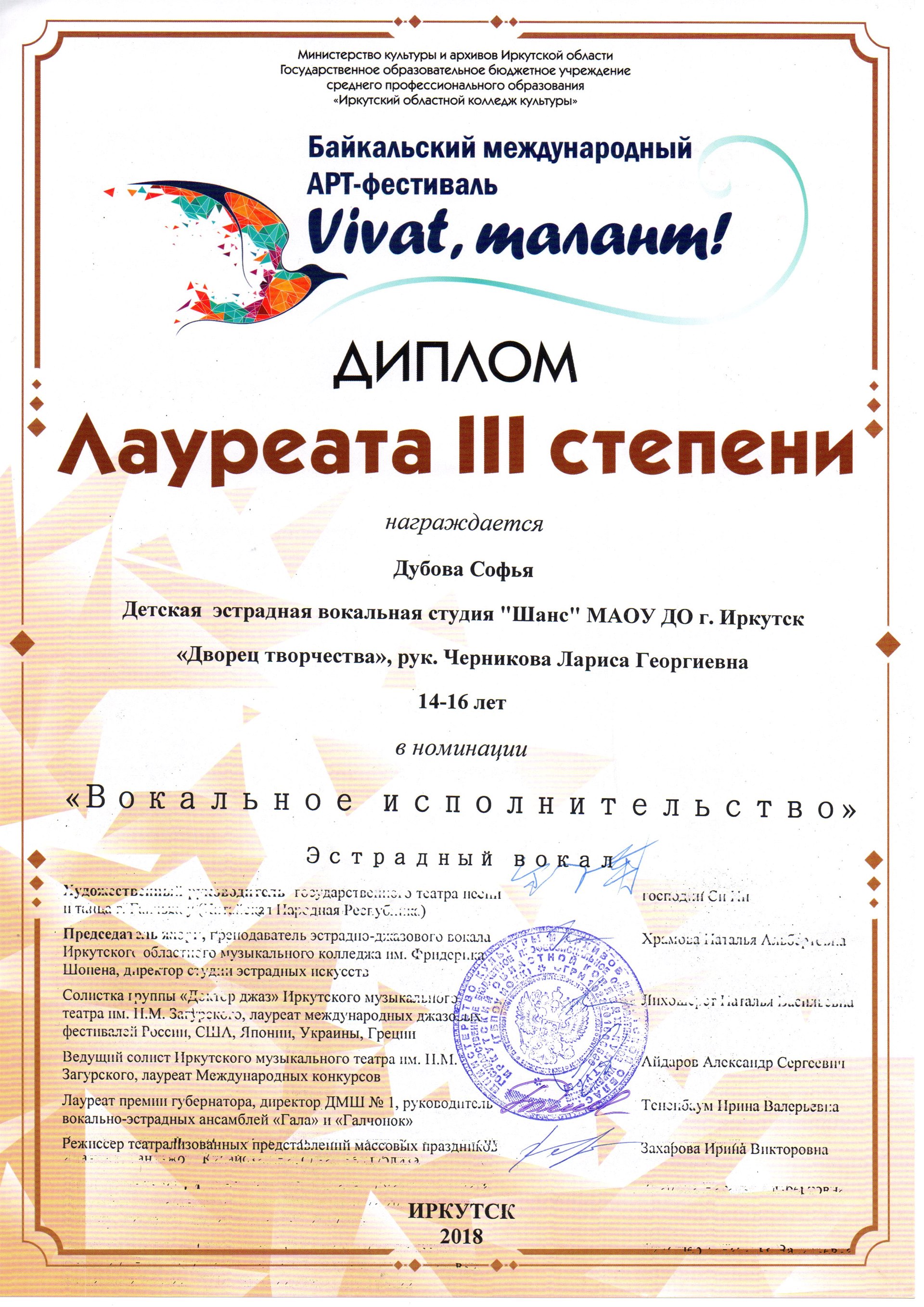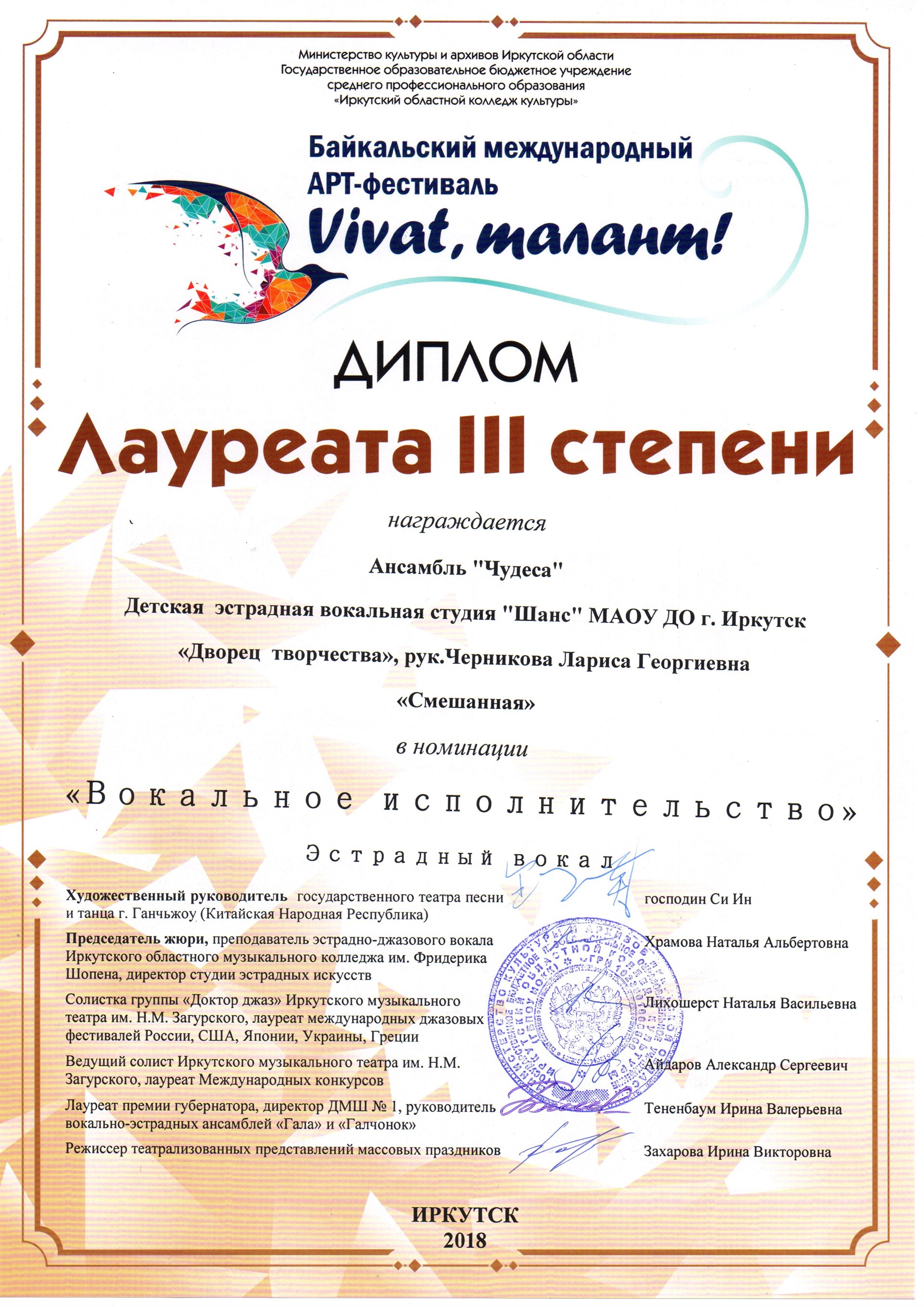 16 февраля в Иркутске стартовал первый международный ART-фестиваль «Vivat, талант! ». Участие в нем приняли более 3480 человек. На фестиваль поступило более 700 заявок из всех муниципальных образований Иркутской области, Республик Саха (Якутия) и Бурятия, Забайкальского края. Участие приняли коллективы из Китайской Народной Республики, а также студенты из Индонезии, Монголии и Республики Конго, которые учатся в России.