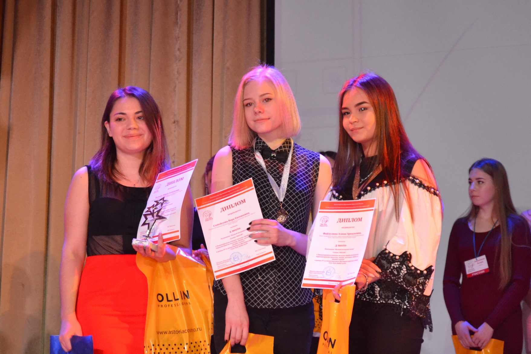 3 участницы выступили менее удачно, но для высокого уровня конкурса, где дети 12-14 лет соревновались со студентками профессиональных колледжей и молодыми мастерами по визажному искусству, это достойно поощрения: Павлова Анастасия заняла 4 место в номинации «Модный вечерний макияж», а самая юная участника конкурса Рипсиме Агоян – 5 место, в этой же номинации, Хангуева Ксения – 5 место в номинации «Модный свадебный образ».