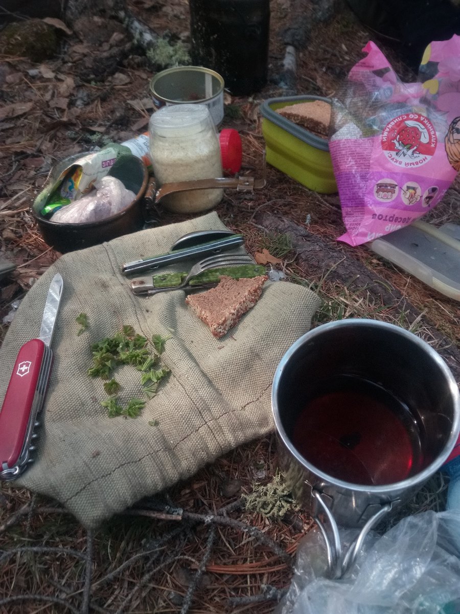 Пока заготавливали дрова, наткнулись на кусты смородины. Нам опять улыбнулась удача, третий раз за день! Смородина уже начала распускать листья, берем немного свежих листиков, перетираем их и добавляем в свежезаваренный чай, который приобретает аромат и привкус смородины.