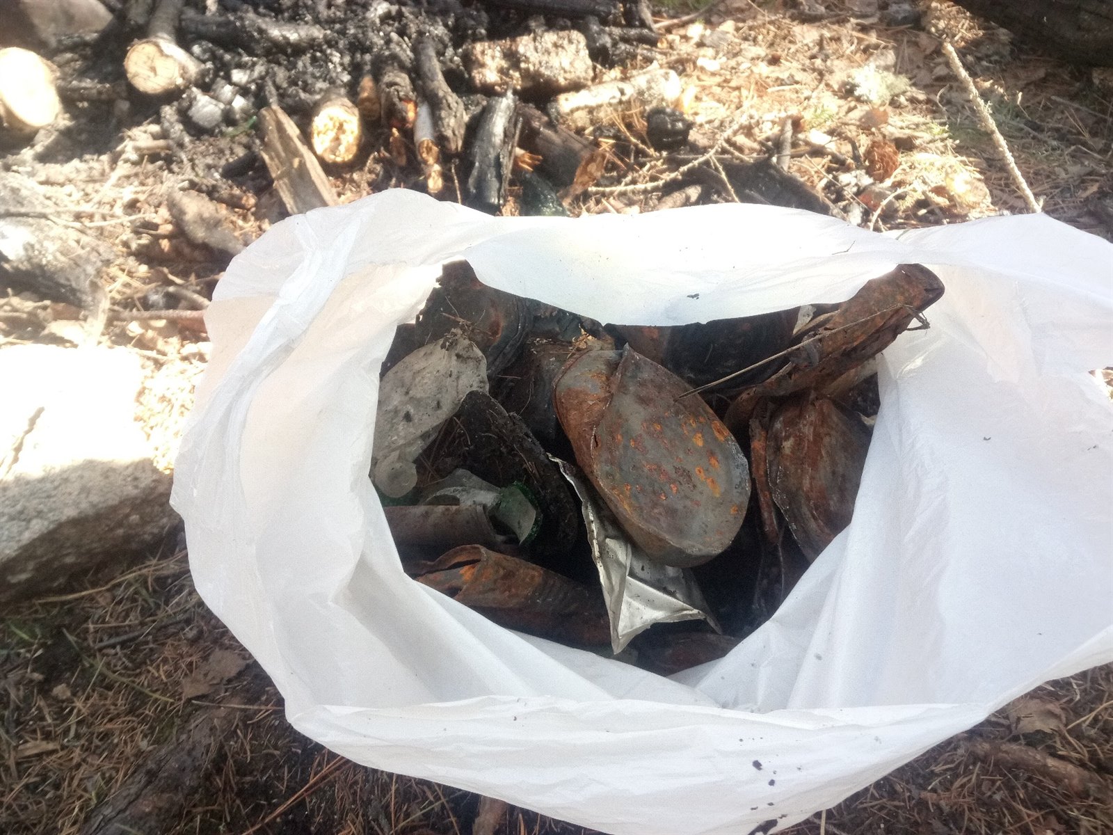 К сожалению, наше время вышло и нам пора собираться в обратную дорогу. Заливаем костер и убеждаемся, что все угли хорошо пролиты водой. Заодно делаем полезное дело, из костровища забираем жестяные и стеклянные банки, и бутылки. С учетом того, что жестяные банки мы сплющили, у нас все равно получился целый большой пакет мусора.