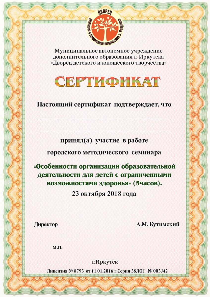 Сегодня, 23 октября 2018 года, на базе МАОУ ДО г. Иркутска «Дворец творчества» прошёл методический семинар «Особенности организации образовательной деятельности для детей с ограниченными возможностями здоровья», в работе которого приняло участие 209 человек. Организация и проведение семинара принадлежит «Дворцу творчества», МКУ «ИМЦРО» в сотрудничестве с ГАУ ДПО ИРО.
