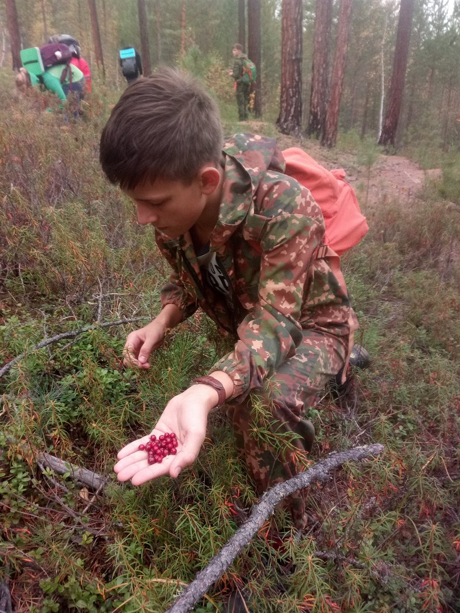 В этот раз подъем в «гору дураков» занял у нас очень много времени, так как под горой было очень много спелой, аж бордовой, БРУсники, которую мы принялись собирать и есть! Ягоды было так много, что горсть набиралась в считанные секунды. Даже совки были не нужны для её сбора. Насытившись ягодой, мы пошли дальше, хотя уходить не хотелось, настолько была спелая и вкусная брусника.