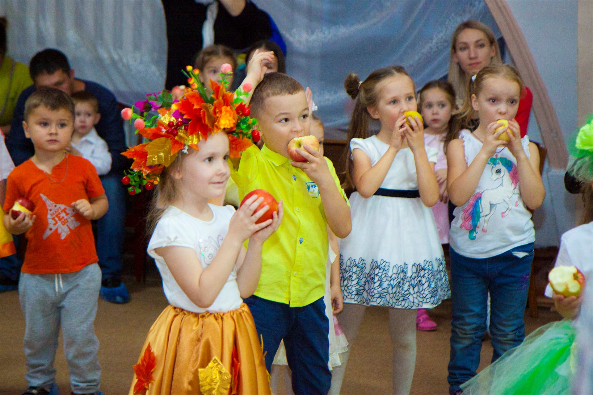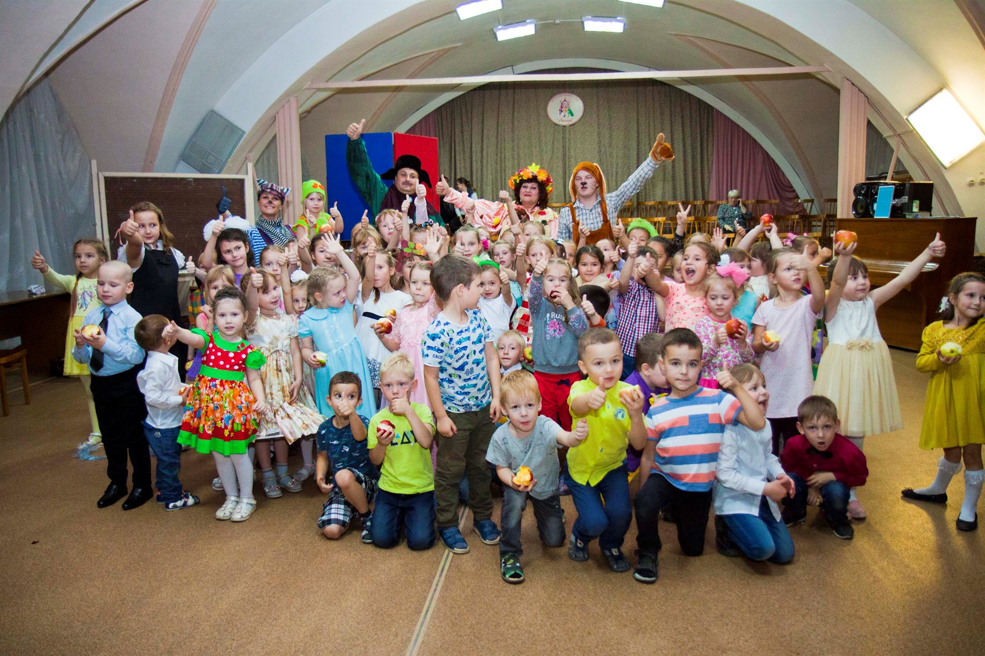 Хотя и говорят, что осень – унылая пора, но дети, как никто другой, способны радоваться золотистым опавшим листьям под ногами и дождичку, под которым так интересно погулять под зонтиком… У нас в зале царила теплая, доброжелательная атмосфера. Дети водили хоровод, пели песенки, танцевали, играли в веселые игры, читали стихи. По завершению праздника щедрая Осень наградила всех ребят своими сочными спелыми дарами – наливными яблоками!