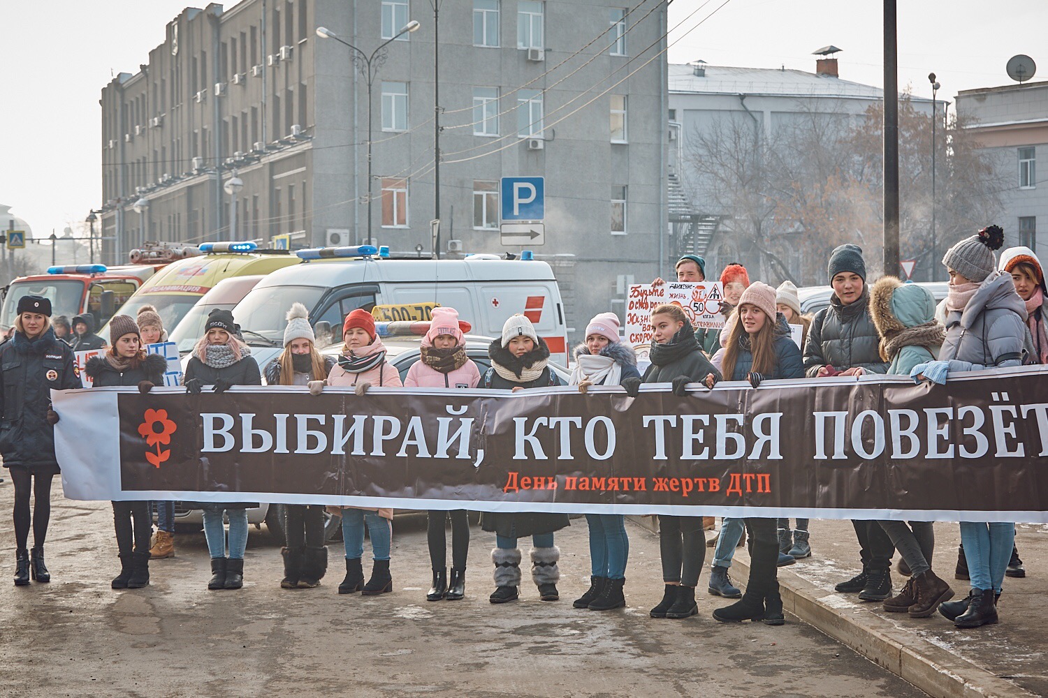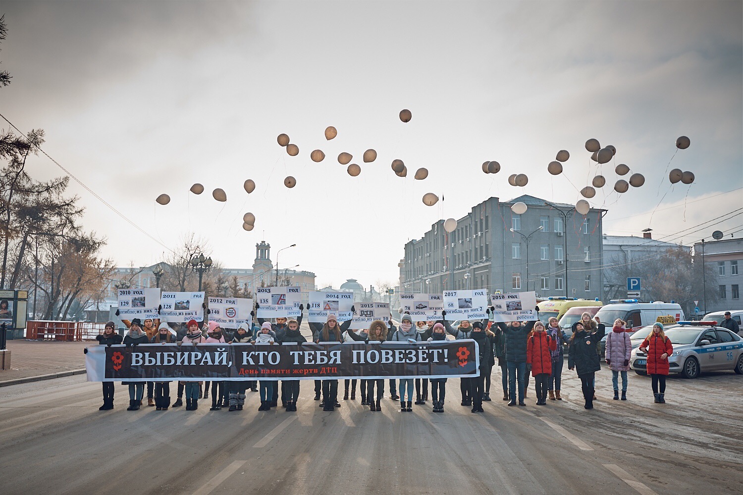 Сегодня во главе со старшими товарищами в погонах воспитанники Дворца творчества г. Иркутска и активистами городского парламента Городской прошли по центральным улицам областного центра с призывами к соблюдению безопасного поведения на улице и проезжей части. В детских руках были плакаты со статистикой смертельных ДТП, начиная с 2010 года и по настоящее время. Конечной точкой шествия стала площадка на Сквере имен Кирова, где выстроились автомашины спецслужб: экипаж ГИБДД, ГУ МЧС России по Иркутской области, автомобилей "Скорой медицинской помощи", Центра медицины катастроф, ритуальной организации и службы такси. Растянувшись по тротуару, школьники развернули баннер со словами "Выбирай, кто тебя повезет?! " и выпустили в небо воздушные шары с именами погибших в ДТП в 2018 году.