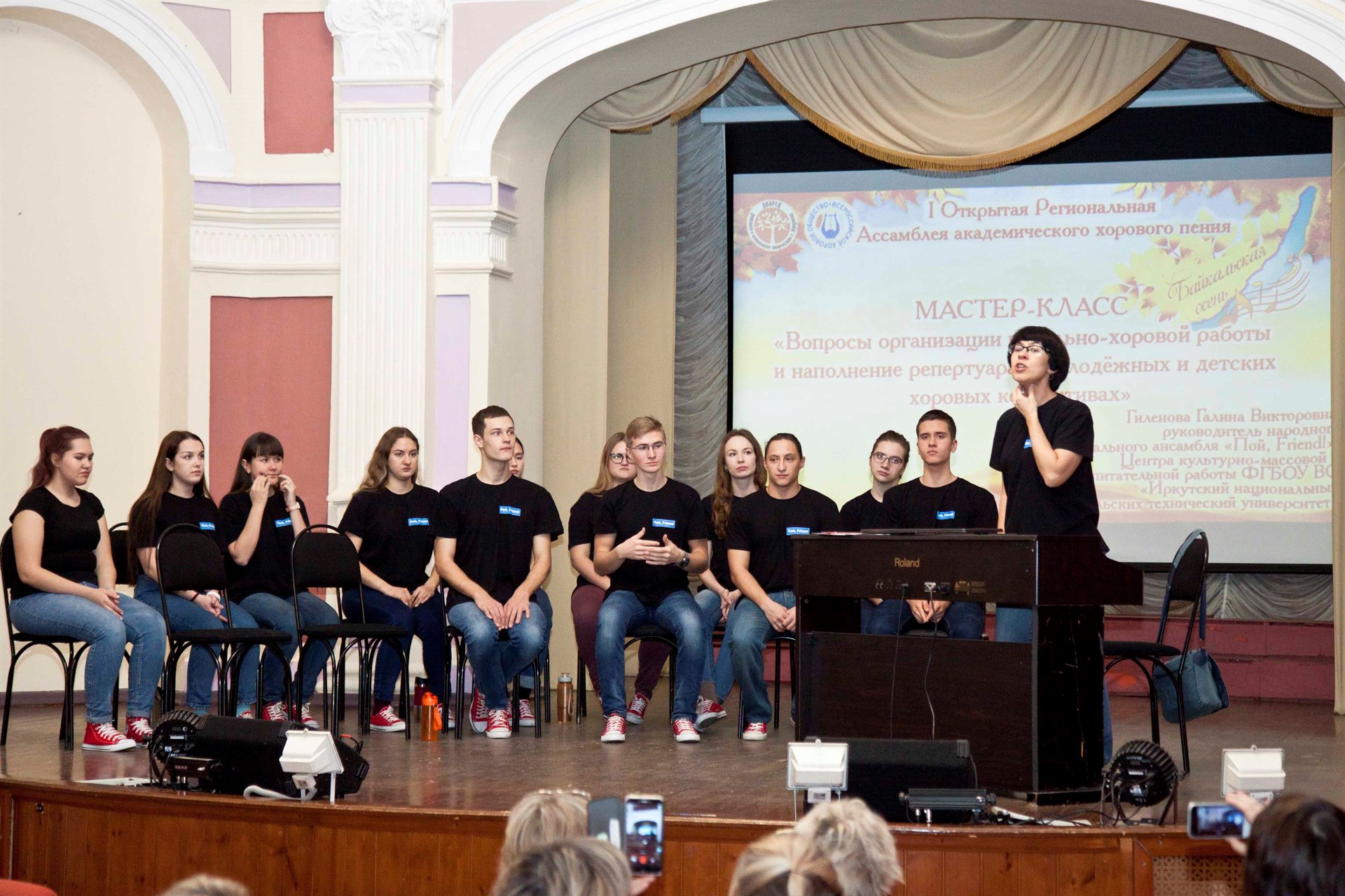 Для руководителей хоровых коллективов были организованы Мастер-классы, где с представлением опыта выступили педагоги Кучеренко Марина Юрьевна, руководитель хоровой студии мальчиков и юношей «Байкал хор», МАОУ ДО г. Иркутска «Дворец творчества», Гиленова Галина Викторовна, руководитель народного вокального ансамбля «Пой, Friend! », Центра культурно-массовой и воспитательной работы ФГБОУ ВО «Иркутский национальный исследовательских технический университет».