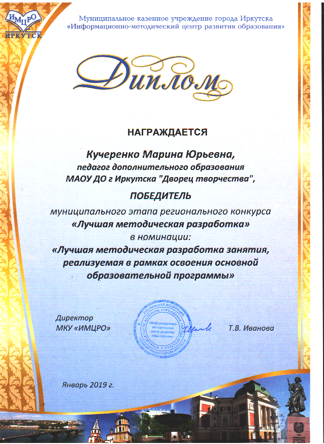 От МАОУ ДО г. Иркутска «Дворец творчества» принимала участие Кучеренко Марина Юрьевна в номинации №1 «Лучшая методическая разработка занятия, реализуемая в рамках освоения основной образовательной программы».