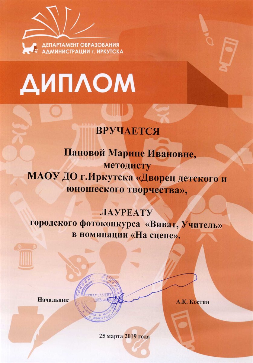 Поздравляем Панову Марину Ивановну, методиста Дворца! Она стала лауреатом номинации «На сцене» c работой «50-летний юбилей хора «Ангара» и дипломантом 2-х номинаций: «Я люблю свою профессию» и «Улыбка учителя».