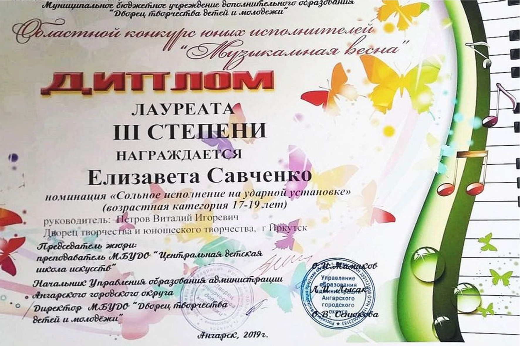 Поздравляем учащуюся класса ударных инструментов «Барабаны» Елизавету Савченко – лауреата областного конкурса юных исполнителей "Музыкальная весна" в номинации "Сольное исполнение на ударной установке". Педагог: Петров Виталий Игоревич.