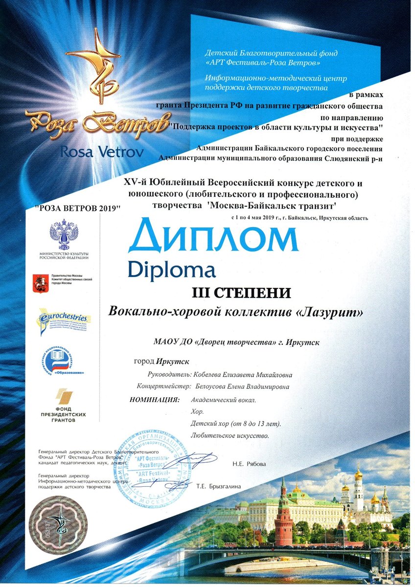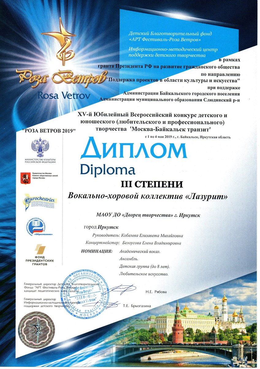 Поздравляем хор Лазурит и его руководителя – Кобелеву Елизавету Михайловну с участием в Всероссийском фестивале "Роза ветров", который прошел в Байкальске с 1 по 4 мая 2019 года. В Фестивале приняло участие сразу два коллектива хора "Лазурит" в номинации «Академический вокал» (Хор. Детский хор. Любительское искусство) в двух возрастных категориях (до 8 лет и 8-13 лет) и стали дипломантами III степени.