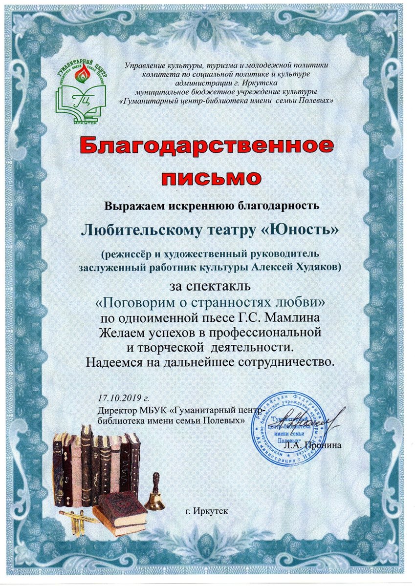 17 октября в рамках проведения цикла мероприятий, посвященных Году театра в России, на сцене Гуманитарного центра библиотеки имени семьи Полевых состоялся спектакль «Поговорим о странностях любви...» по одноименной пьесе Г.С. Мамлина, который представил театр «Юность» Дворца творчества (режиссёр и художественный руководитель – заслуженный работник культуры Алексей Алексеевич Худяков).