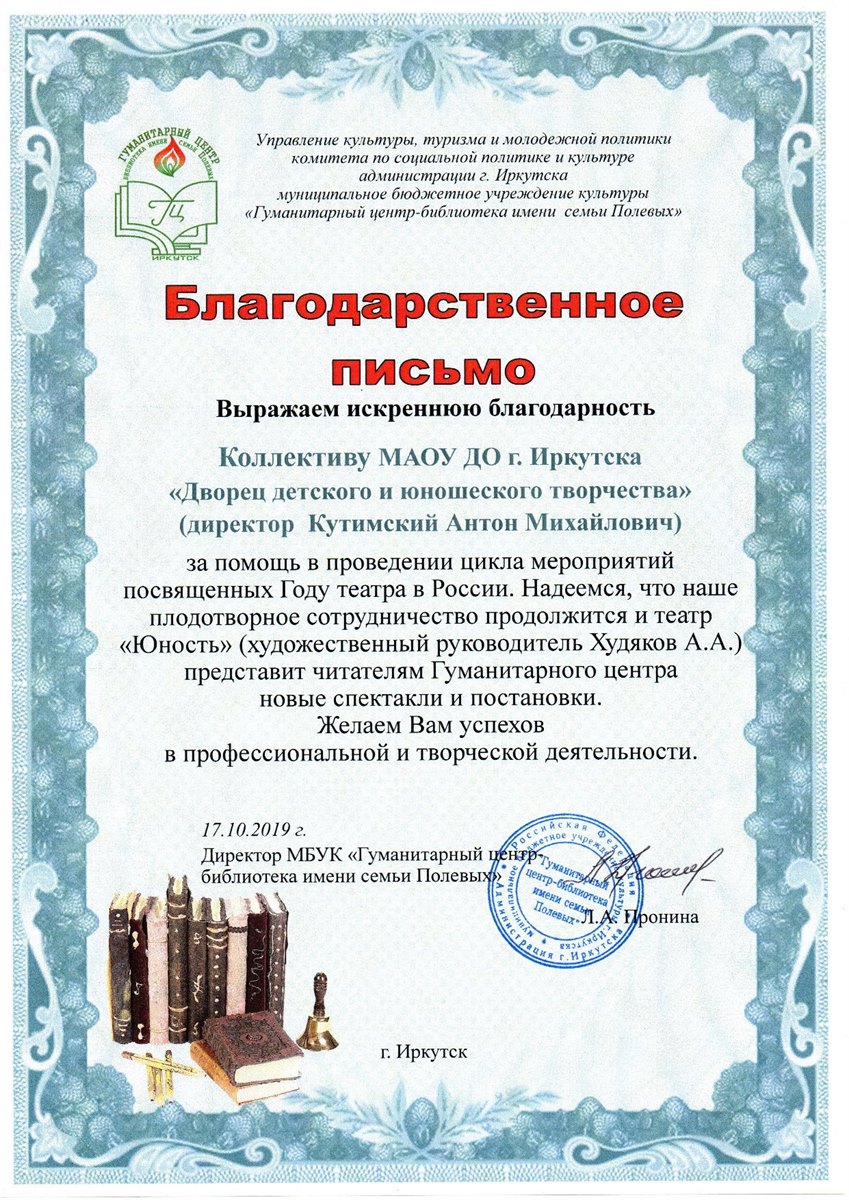 Коллектив библиотеки и зрители, поблагодарили театр "Юность" и пригласили в гости с новыми спектаклями!