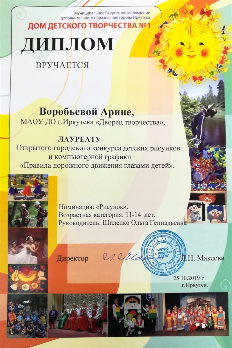 Воспитанница Дворца, Воробьева Арина (14 лет), стала лауреатом в номинации «Рисунок». Работа называется «Соблюдайте правила дорожного движения! » Педагог Шиленко Ольга Геннадьевна.
