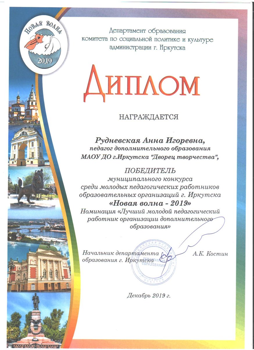 Администрация и педагогический коллектив Дворца творчества поздравляет Рудневскую Анну Игоревну, педагога дополнительного образования, с абсолютной победой в муниципальном конкурсе среди молодых педагогических работников учреждений дополнительного образования г. Иркутска «Новая волна – 2019».