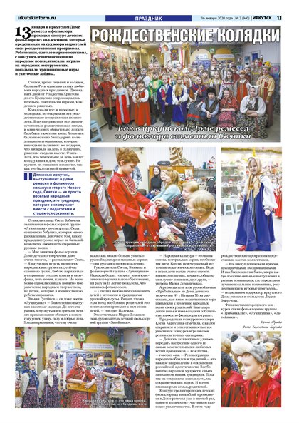 13 января в Иркутском краеведческом музее в канун Старого нового года в выставочном отделе "Музейная студия" состоялась интерактивная, театрализованная, праздничная программа "Рождественские колядки" для горожан всех возрастов, которую представил фольклорный ансамбль "Лучинушка" Дворца детского и юношеского творчества.
