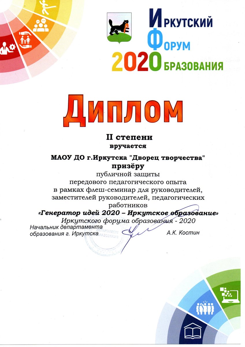 31 января в рамках работы Иркутского форума образования-2020 Дворец творчества представил проект "Классный выходной" на флеш-семинаре для руководителей образовательных организаций "Генератор идей 2020". Данный проект является отправной точкой для взаимодействия школ и Дворца творчества в реализации мультидисциплинарных программ в субботние дни. На сегодняшний момент создается площадка из 15 школ г. Иркутска, где будут опробованы данные программы и образовательная суббота в школах приобретет интересный и современный формат.