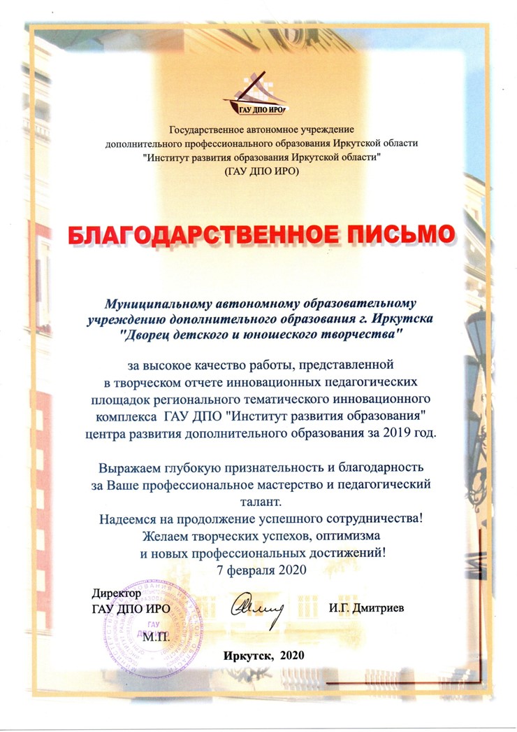 По результатом творческого отчета Дворец творчества был награжден благодарственным письмом за высокое качество работы, а заместитель директора Дворца творчества Татарникова Татьяна Александровна была награждена благодарностью за эффективное взаимодействие с ГАУ ДПО "Институт развития образования" в рамках реализации проектов и мероприятий.