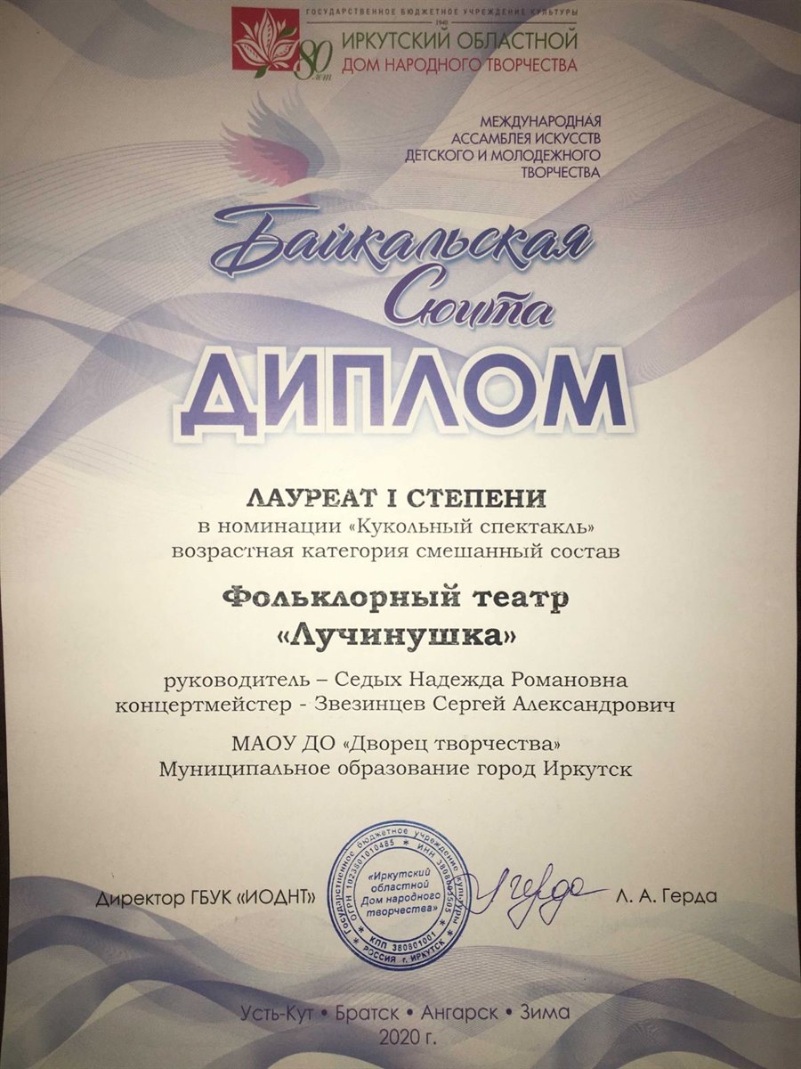 Лауреатом I степени в номинации «Кукольный спектакль» стал фольклорный театр «Лучинушка» МАОУ ДО г. Иркутска «Дворец творчества», руководитель Седых Надежда Романовна, концертмейстер Звезинцев Сергей Александрович.