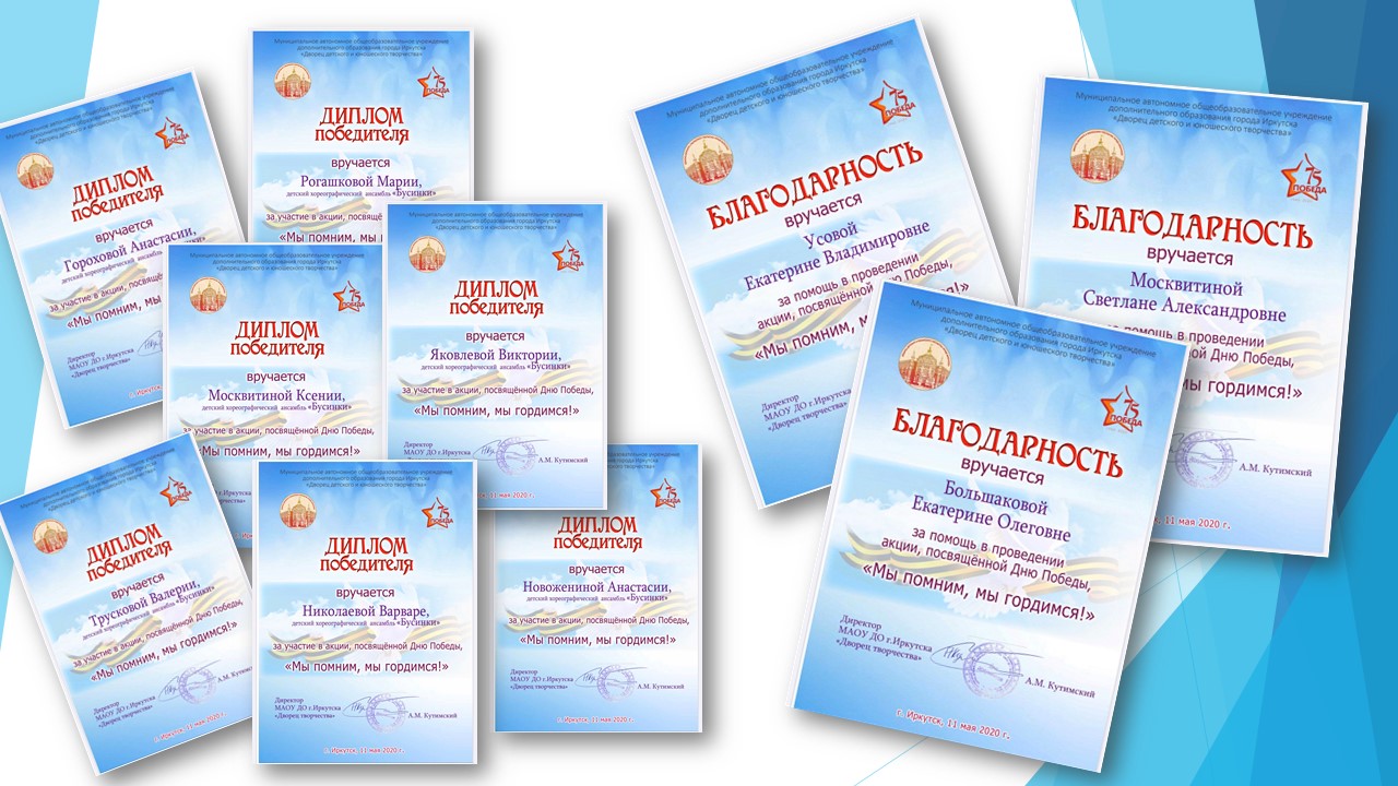 С 30 апреля по 10 мая детский хореографический ансамбль "Бусинки" проводил акцию, посвященную 75-летию Великой Победы.