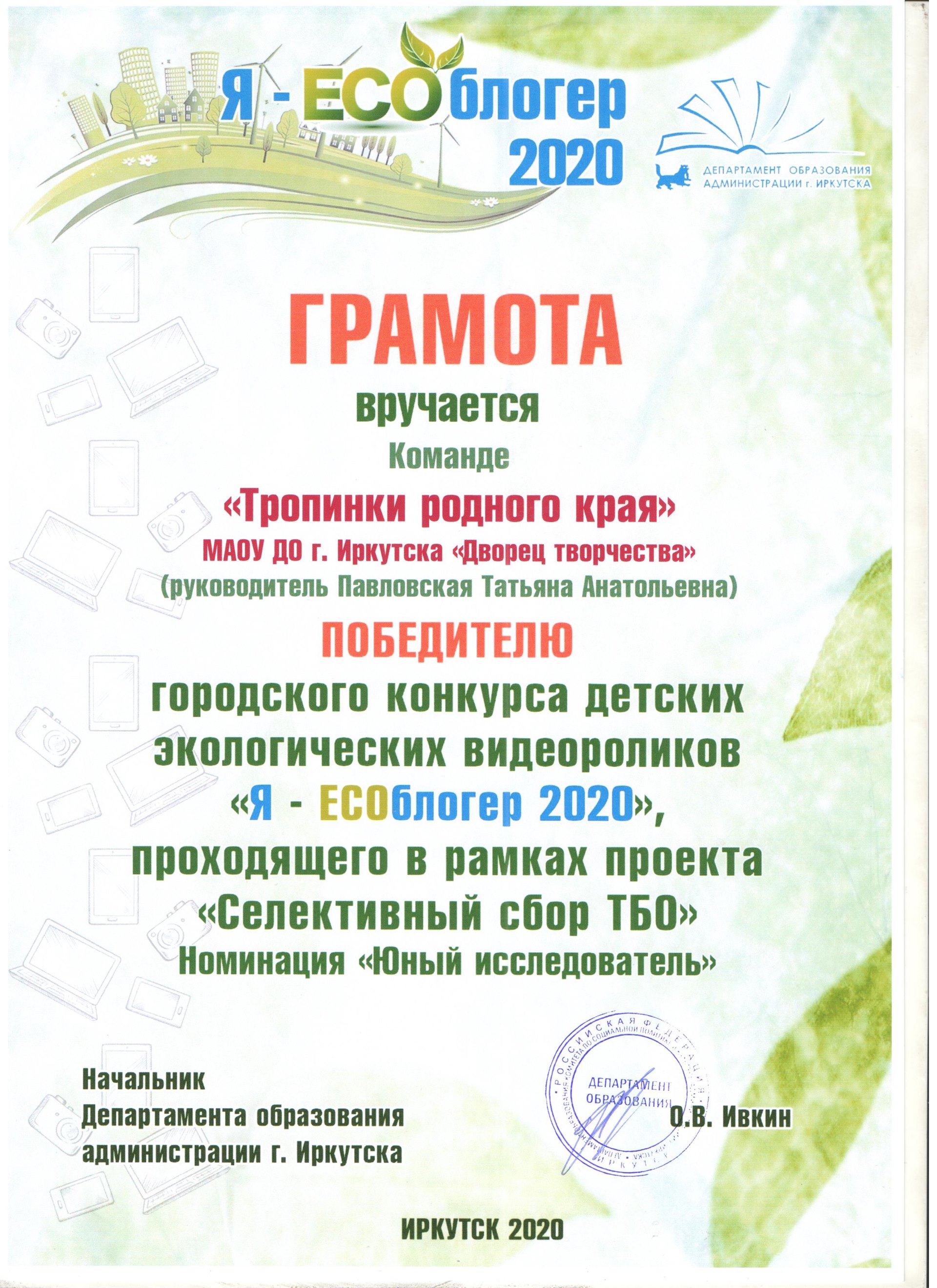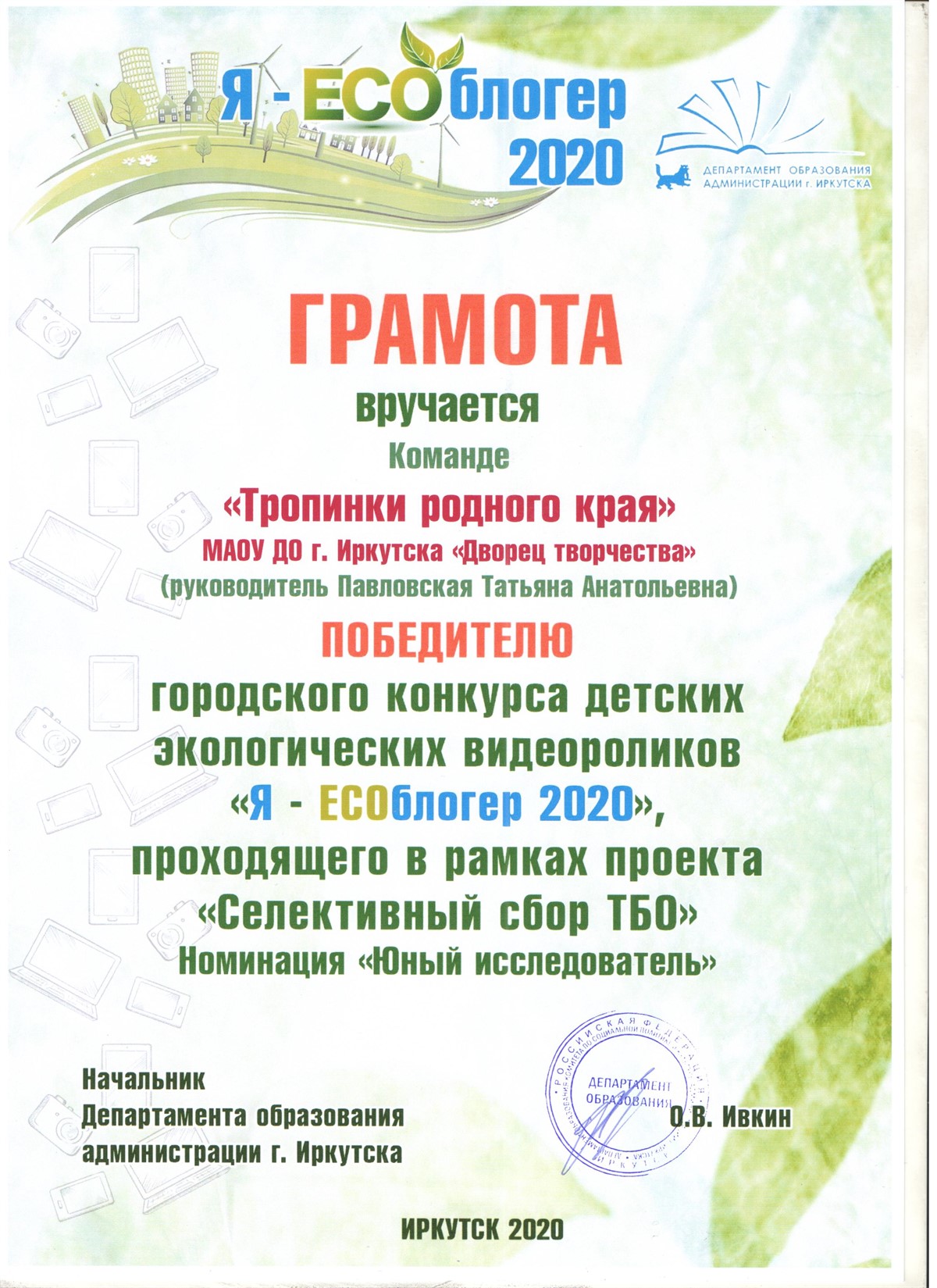 В номинации «Домашний эколог» победители: МАОУ ДО г. Иркутска "Дворец творчества" студия телевидения «СОК» с роликом «Спирогира на Байкале», экологическая команда «Эко.театр» и творческое объединение «Тропинки родного края», а также МБОУ СОШ № 64 «Социальный ролик», МБОУ СОШ № 4 «Секреты эко.семьи», и МБОУ СОШ № 65 «Видеорассказ об экологических привычках членов семьи в домашнем быту, направленных на уменьшение загрязнения окружающей природной среды».