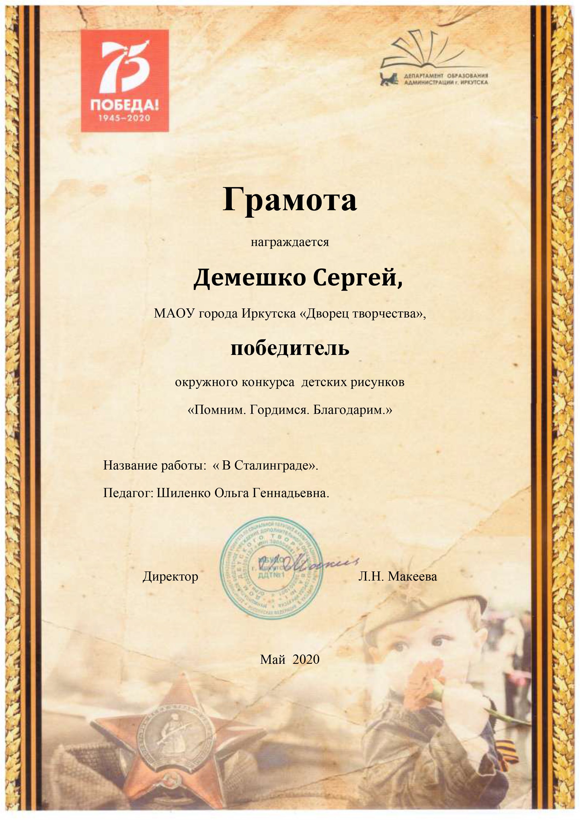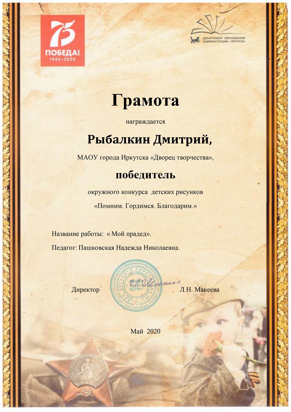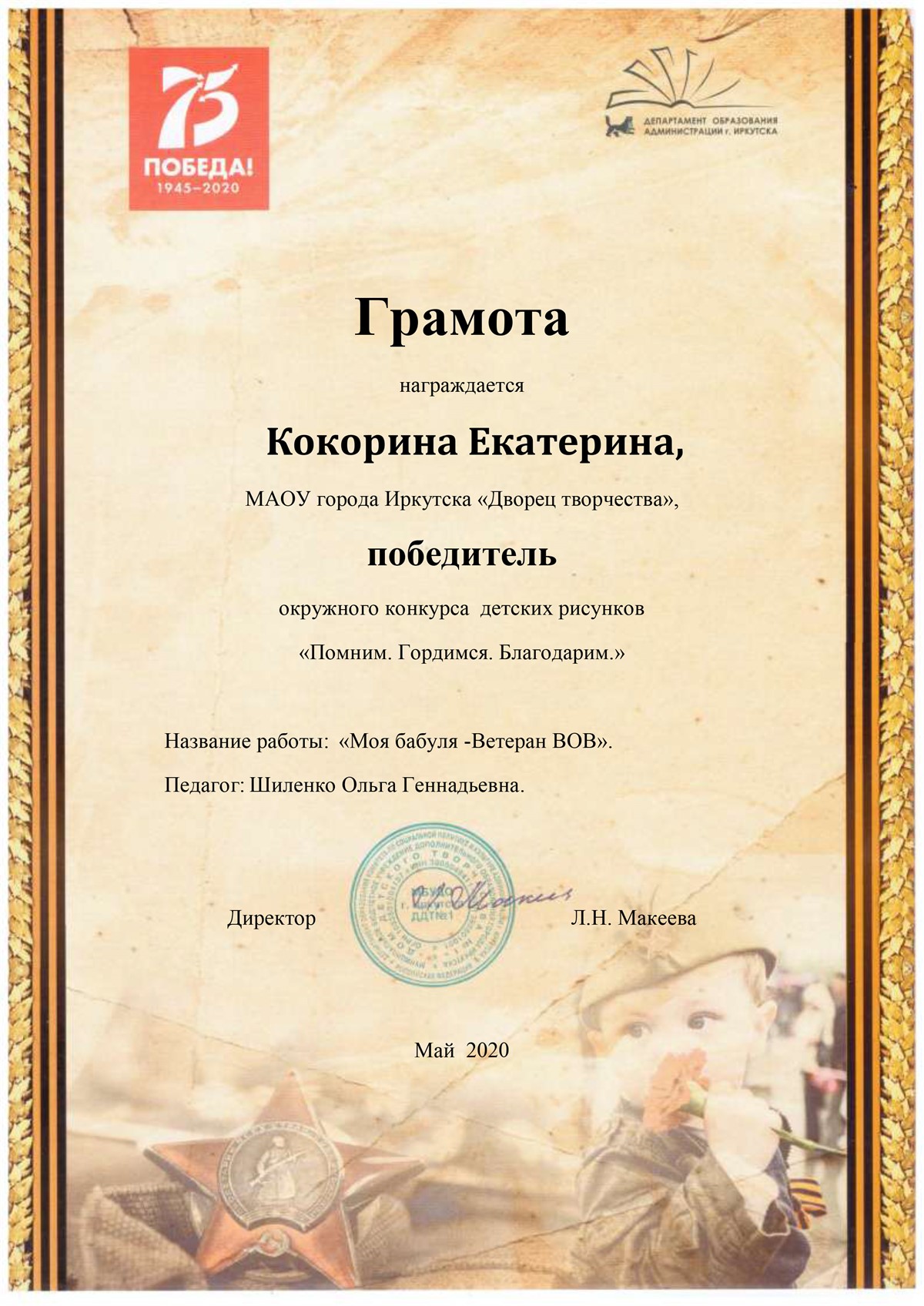 Администрация Правобережного округа г. Иркутска, Дом детского творчества №1 и Совет ветеранов войны, труда Правобережного округа г. Иркутска провели окружной конкурс детских рисунков «Помним. Гордимся. Благодарим», в котором приняли участие наши кружковцы.