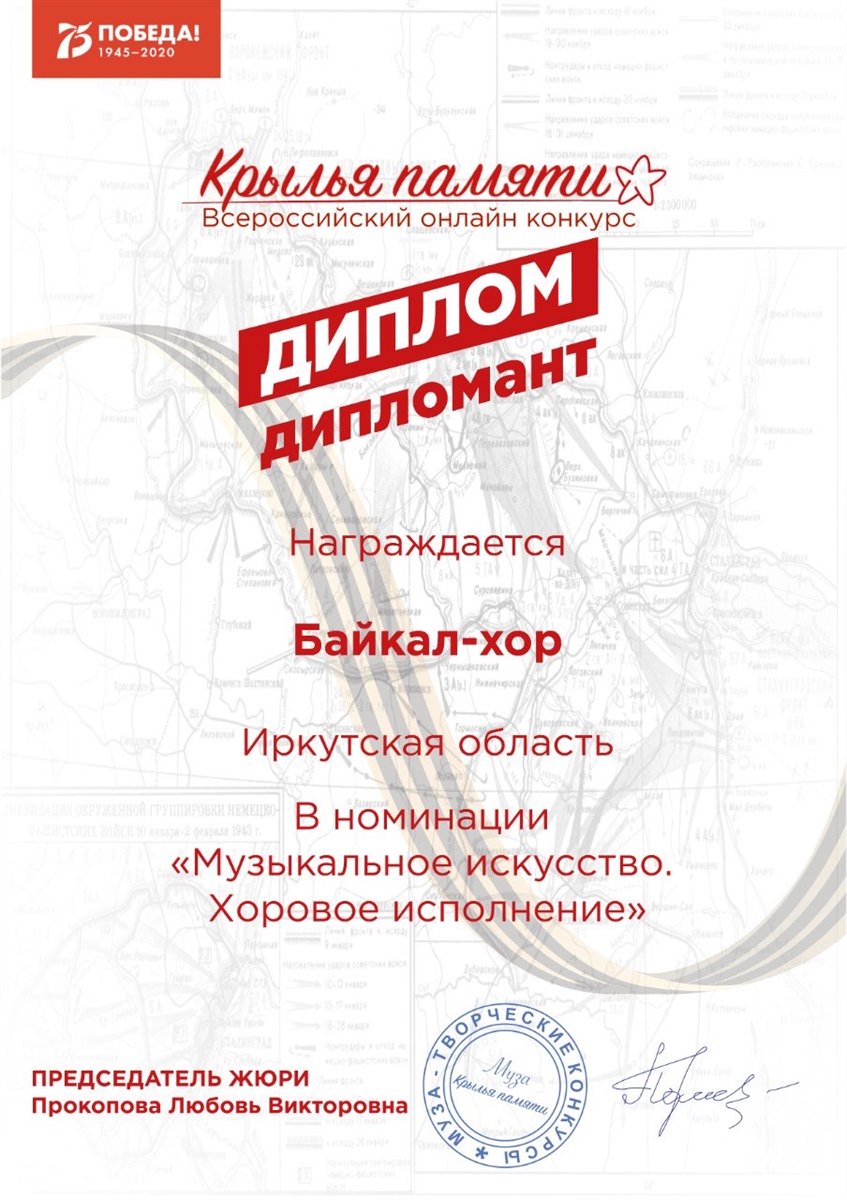 Хоровая студия мальчиков и юношей «Байкал-хор», руководитель Кучеренко Марина Юрьевна, педагог Третьякова Анна Владимировна приняла участие во Всероссийском творческом конкурсе, посвященном 75-летней годовщине Победы в Великой Отечественной войне. Заявки на участие вместе с конкурсными работами принимались с 4 по 20 мая 2020 г. Итоги были подведены 22 мая и опубликованы на сайте организаторов.
