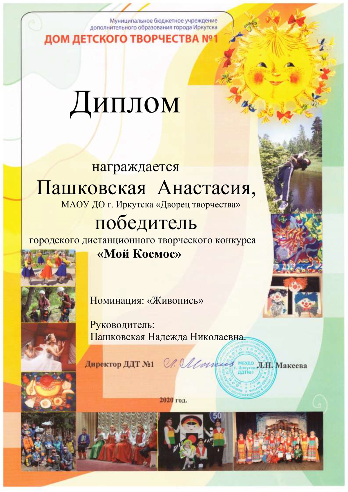 Департамент образования комитета по социальной политике и культуре администрации города Иркутска и МБУДО г. Иркутска «Центр детского технического творчества» провели городской конкурс-выставку семейного творчества «Фантазируем вместе», в котором приняли участие учащиеся творческих объединений декоративно-прикладного и технического творчества Дворца творчества: "Волшебный квиллинг", "Калейдоскоп", "Скульптура и керамика", "Декоративное плетение и дизайн". Каждый участник получил сертификат. Лучшие работы были награждены грамотами Департамента образования.
