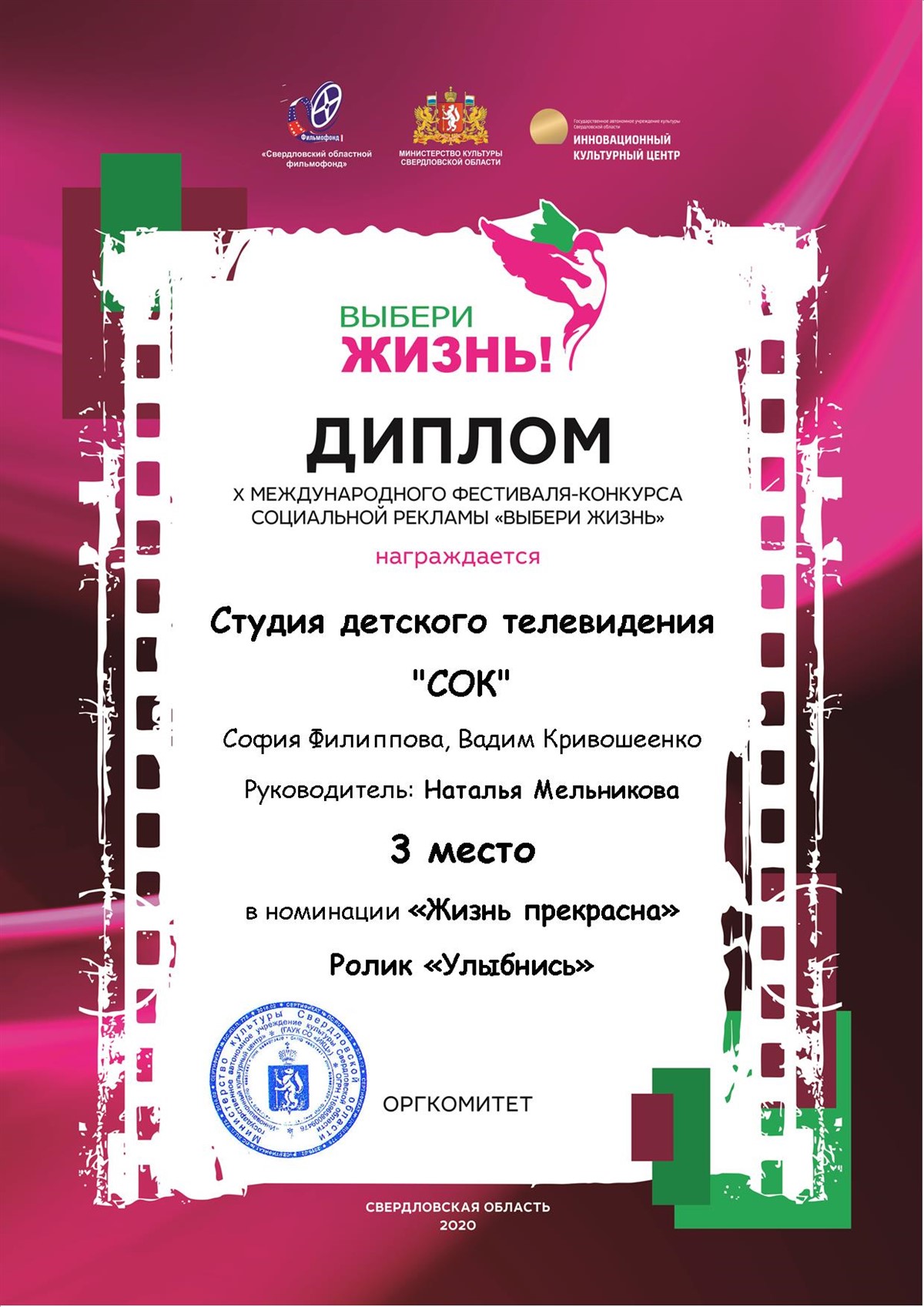 Детская студия телевидения "СОК" победила в Х Международном конкурсе социальной рекламы «Выбери жизнь», организатор – «Свердловский областной фильмофонд» государственного автономного учреждения культуры Свердловской области «Инновационный культурный центр».