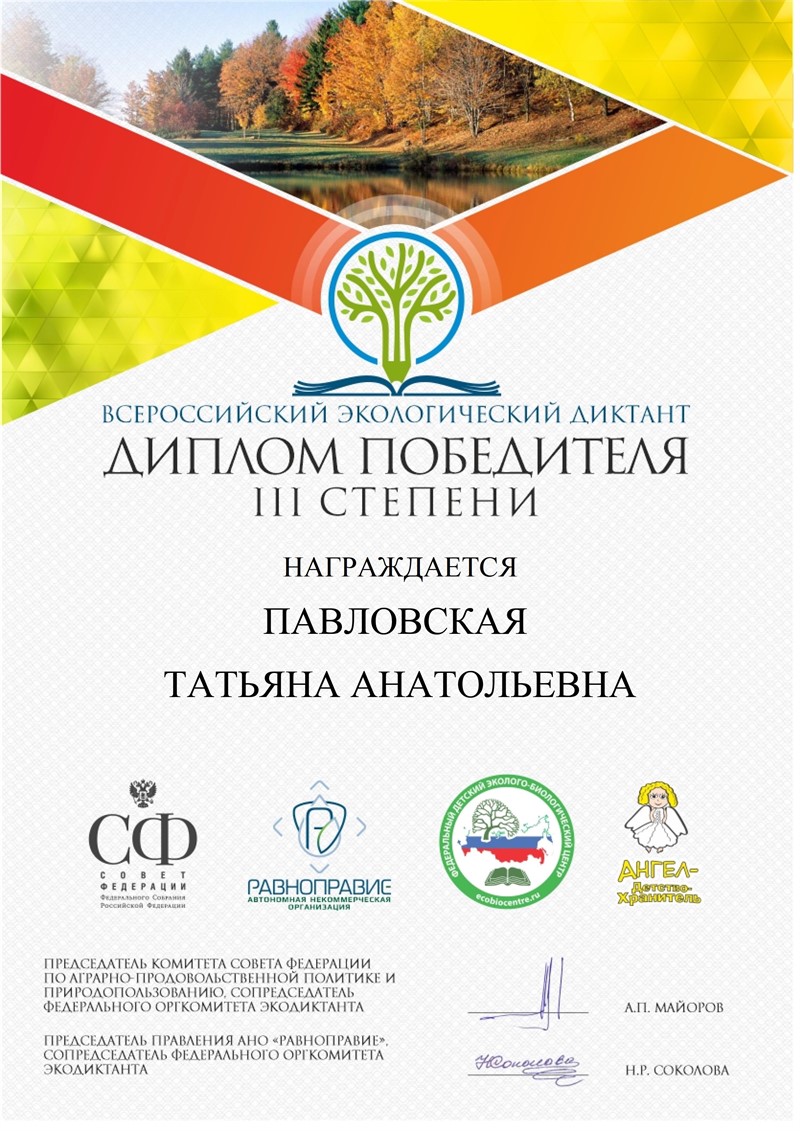 Всероссийский экологический диктант завершён! Участие в Экодиктанте повышает уровень экологической грамотности сотрудников организаций всех отраслей на территории 85 регионов России. В зависимости от количества набранных баллов участники получили в электронном виде сертификат участника или диплом победителя I, II, III степеней. Поздравляем Павловскую Татьяна Анатольевну, педагога дополнительного образования Дворца творчества!