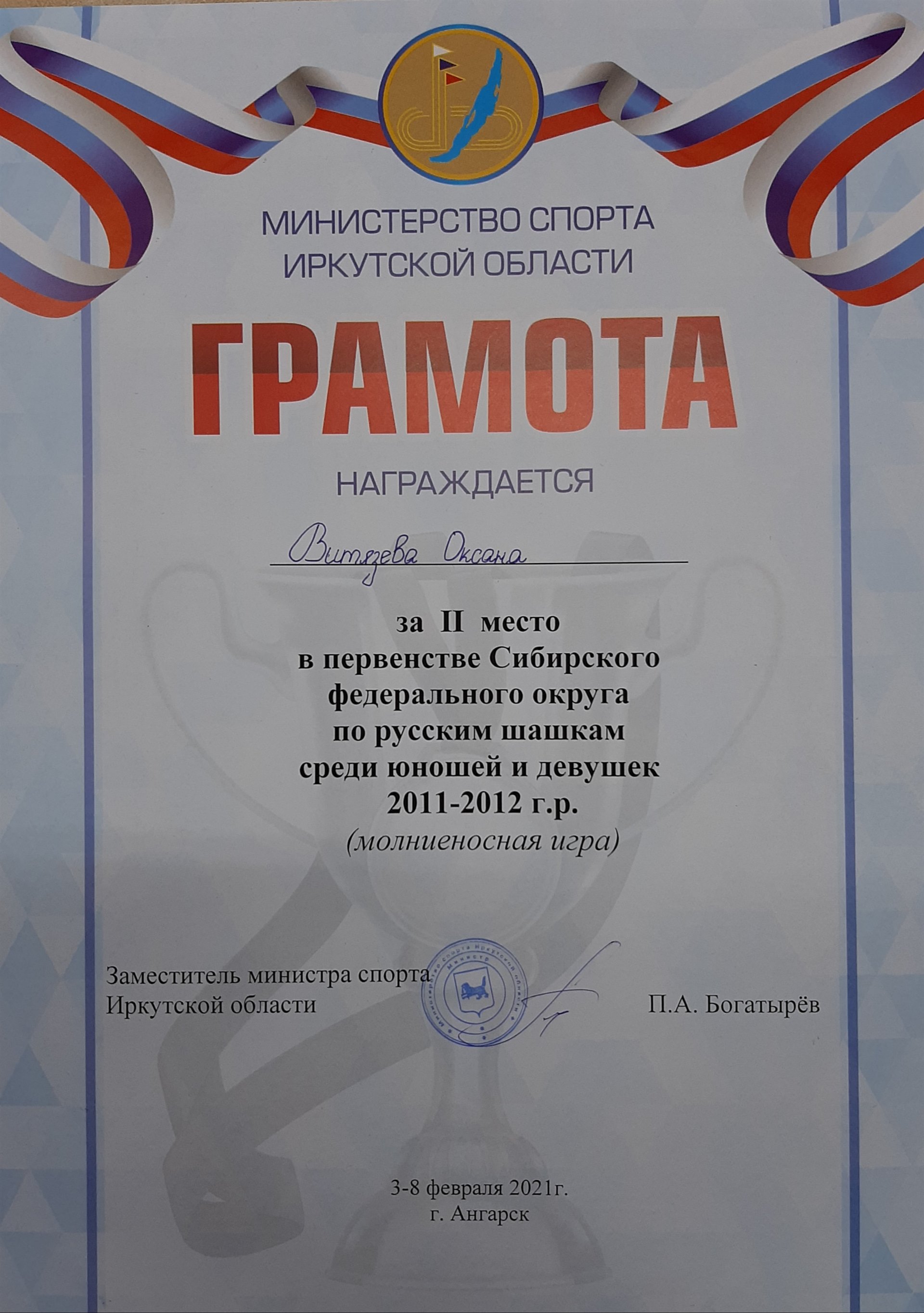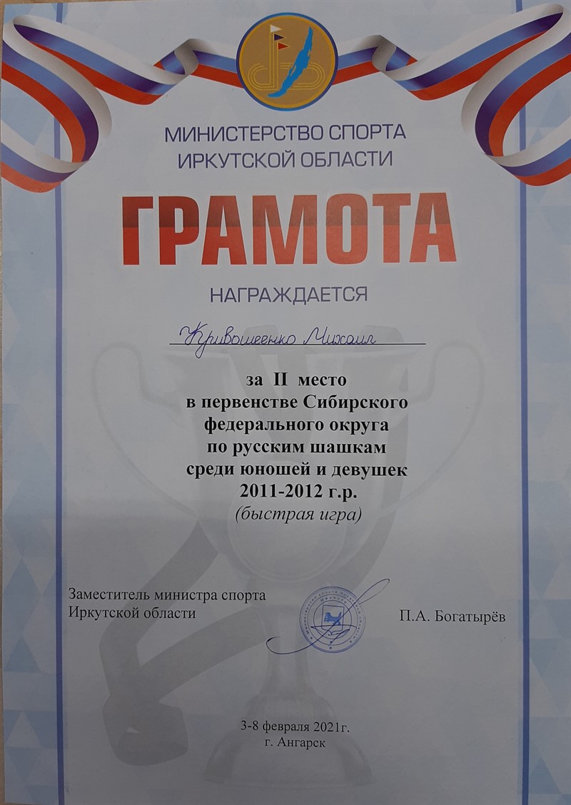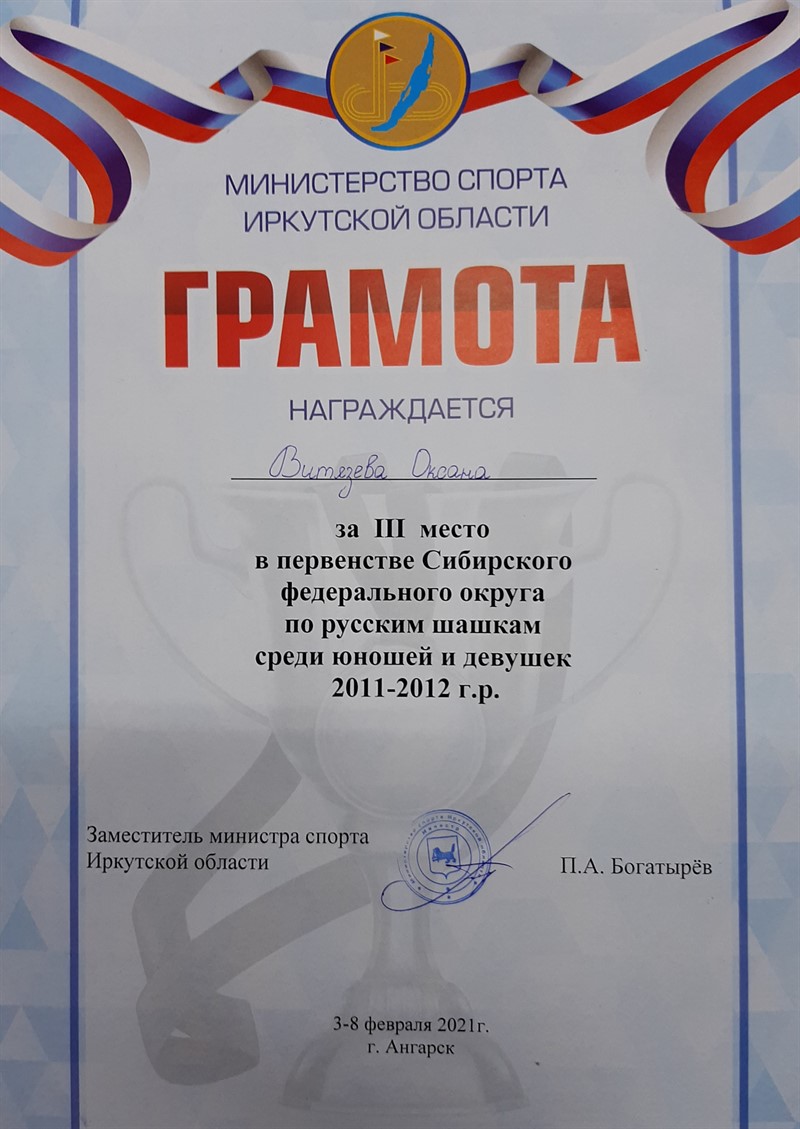 - Витязева Оксана – бронзовая медаль в классической программе и серебряная медаль в молниеносной программе среди девочек 2011-2012 г.р.