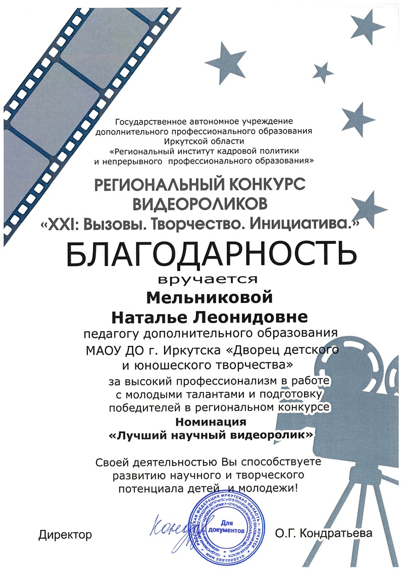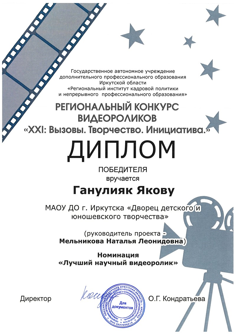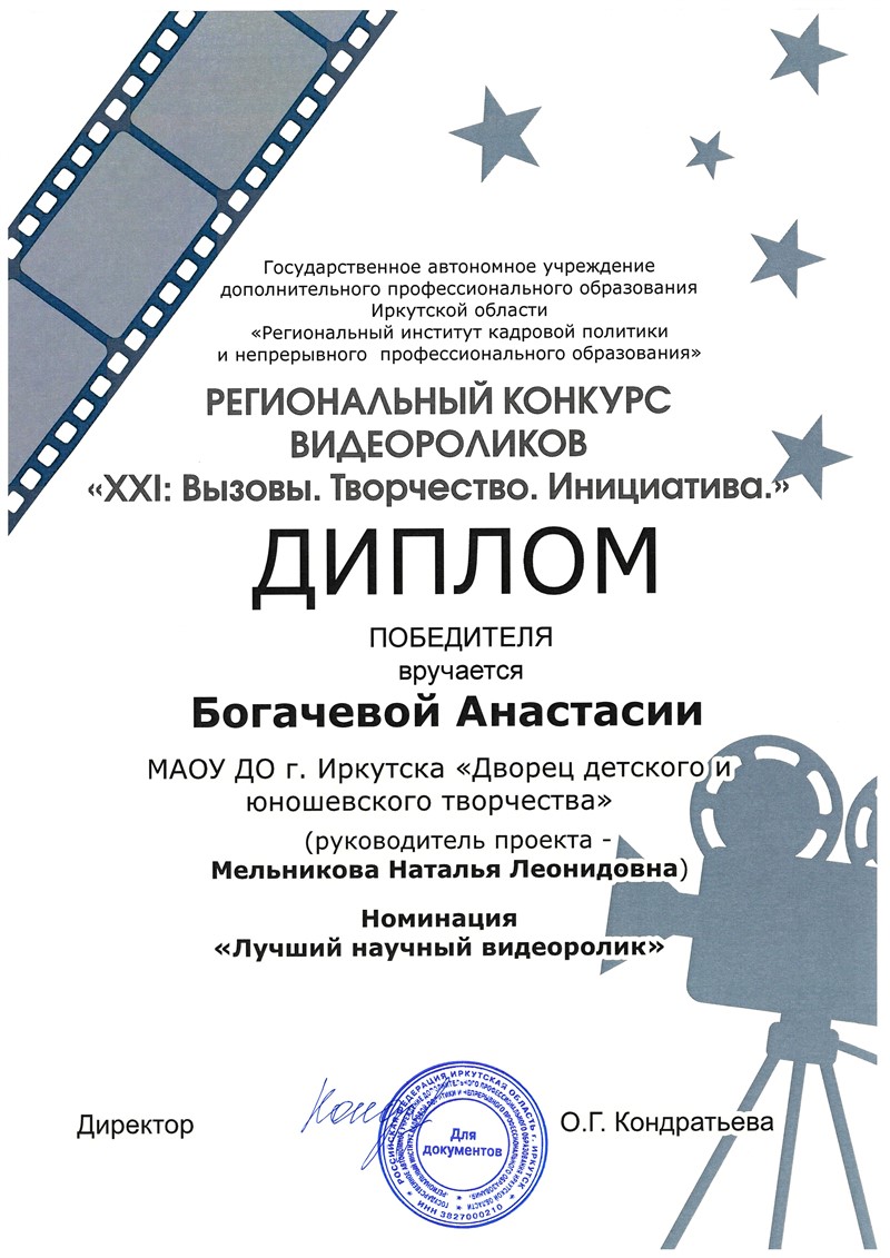 В номинации «Лучший научный видеоролик» победителем стал коллектив учащихся Дворца творчества г. Иркутска, руководитель – Мельникова Наталья Леонидовна, педагог дополнительного образования.