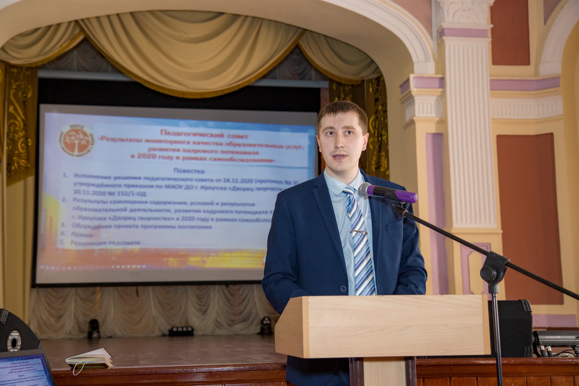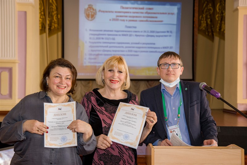 В ходе работы педагогического совета были обсуждены результаты деятельности Дворца творчества за 2020 год. Антон Михайлович Кутимский, директор, представил информацию об эффективности государственно-общественного управления во Дворце творчества.Татьяна Александровна Татарникова, заместитель директора, проанализировала кадровый потенциал Учреждения на 01.01.2021., работу с педагогическими кадрами по развитию их профессиональных компетенций в соответствии с профессиональным стандартом «Педагог дополнительного образования детей и взрослых», представила достижения педагогических работников за 2020 год. Ольга Олеговна Мукменова представила результаты самообследования по образовательной деятельности, а Сергей Владимирович Перфильев говорил об аналитике воспитательного процесса в Учреждении и проведении массовых мероприятий.