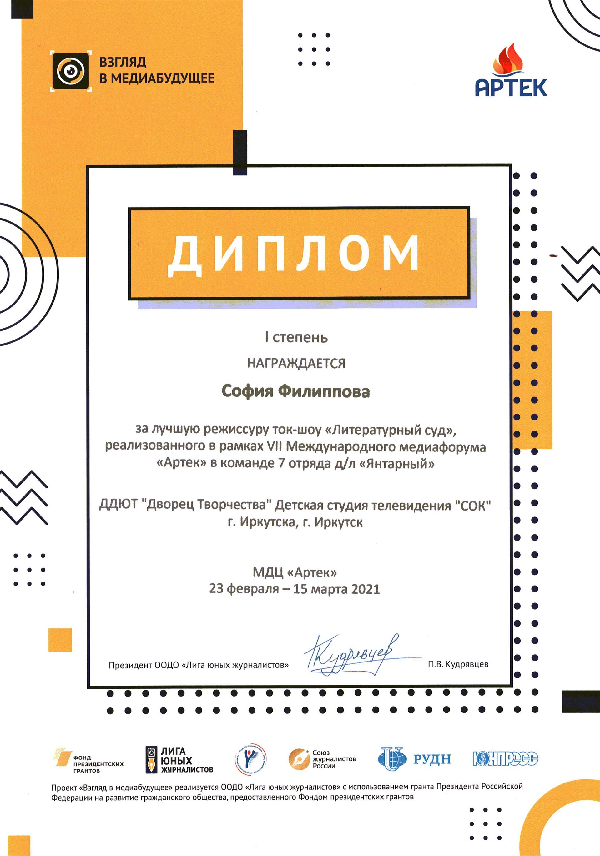 София Филиппова: «Артек – это медиа площадка, где у детей есть возможность творить и развиваться. Моя команда провела два прямых эфира ток-шоу “Литературный суд”. Я работала в качестве режиссёра. Это был незабываемый опыт».