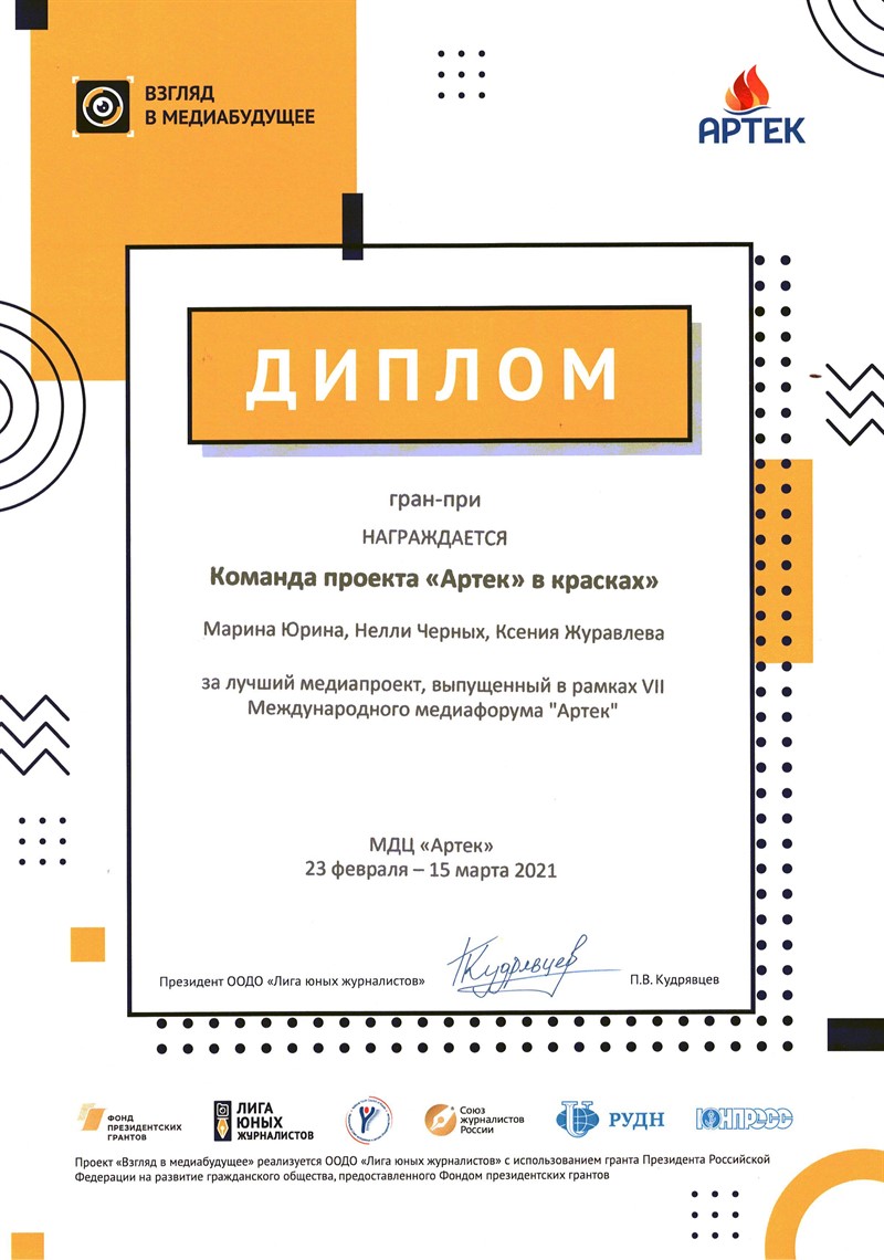 София Филиппова, Вадим Кривошеенко и Нелли Черных – активные участники конкурсов различного уровня. Участие в Медиафоруме в Артеке – результат победы в конкурсе «Взгляд в медиабудущее», организатором которого является Лига юных журналистов и портал Юнпресс.