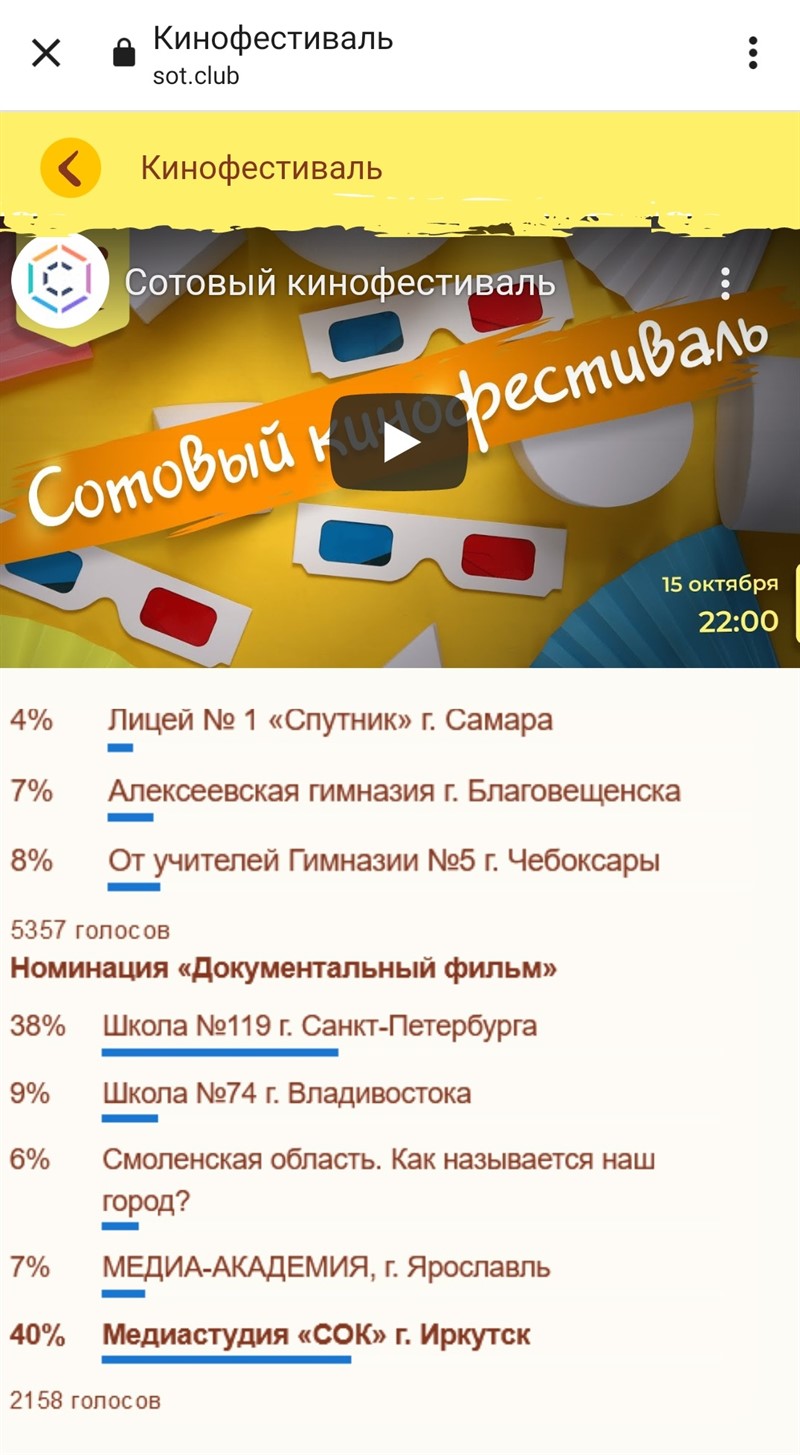 С 15 по 17 октября в Ялте прошло большое образовательное событие – образовательный форум СОТ (Стратегия Образовательных Траекторий), которое собрало педагогов со всей России. Организатором форума стал Образовательный союз России при поддержке Минпросвещения. В рамках форума был объявлен Сотовый кинофестиваль, где юные журналисты и кинематографисты могли представить свои работы о городе, школе, творческом объединении. На конкурс было отправлено более 300 работ. Жюри выбрало 15 лучших работ, по 5 в каждой номинации: «Визитка», «Игровой фильм», «Документальный фильм». В крайней номинации в топ лучших работ вошла работа Медиастудии «СОК», рассказывающая о творческом объединении и о «Дворце творчества». 15 октября на фестивале прошел онлайн просмотр лучших фильмов, подготовленных школьными медиа-командами в рамках модуля самопрезентации образовательной программы Форума СОТ, а также стартовало голосование за лучшую работу. В течение двух дней за работу студии «СОК» активно голосовали ребята и родители всех творческих объединений «Дворца творчества», педагоги, друзья, неравнодушные иркутяне. 17 октября, в 21.30 на прямой трансляции из Ялты, с торжественного закрытия форума СОТ был объявлен победитель – Медиастудия «СОК» обошла студии из Владивостока и Санкт-Петербурга и одержала победу.