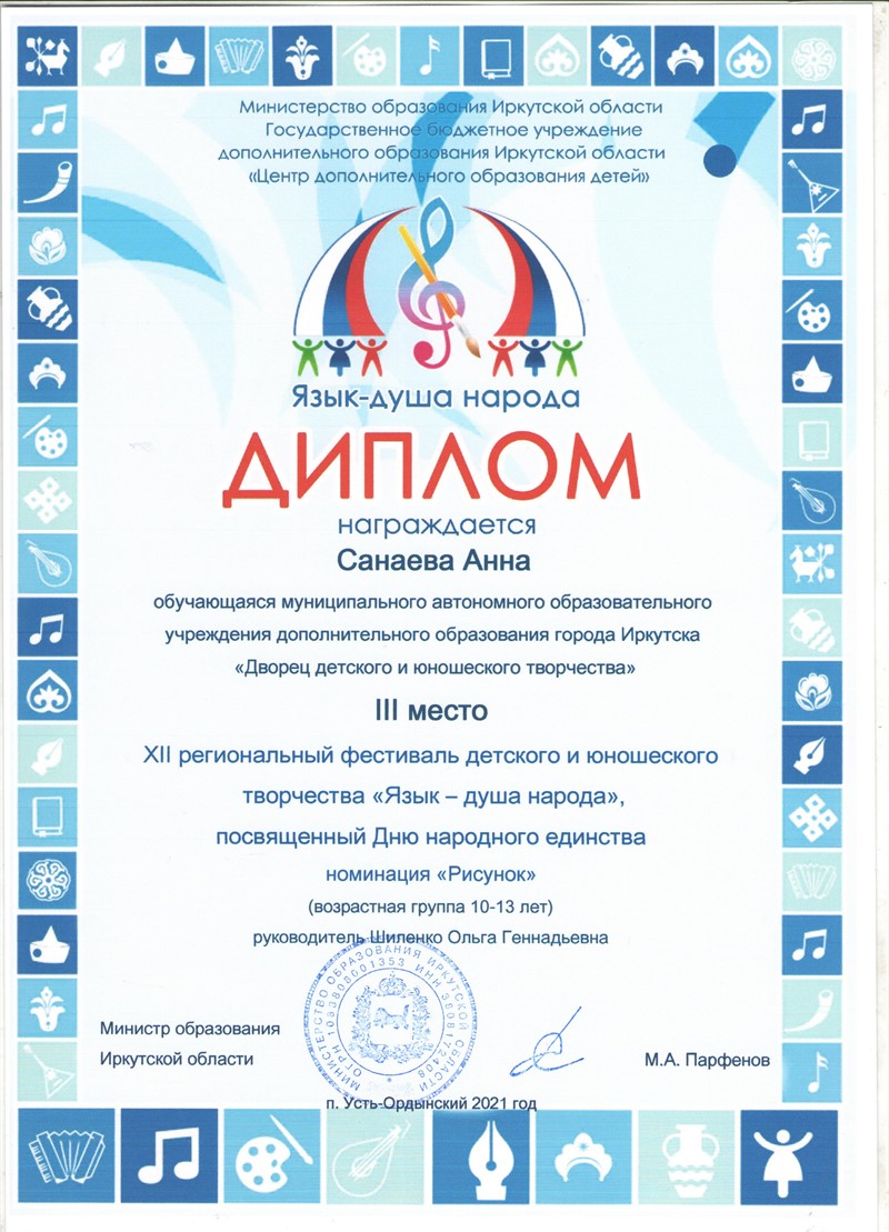 В конкурсе рисунков «Мы разные, но мы вместе. Мы – россияне! » 3 место присудили Санаевой Анне, 12 лет, педагог Шиленко О.Г. за работу «Танцующая девушка». 2 место за работу «Рождественский хоровод у елки» жюри присудило Головиной Елизавете, 13 лет, педагог Шиленко О.Г.