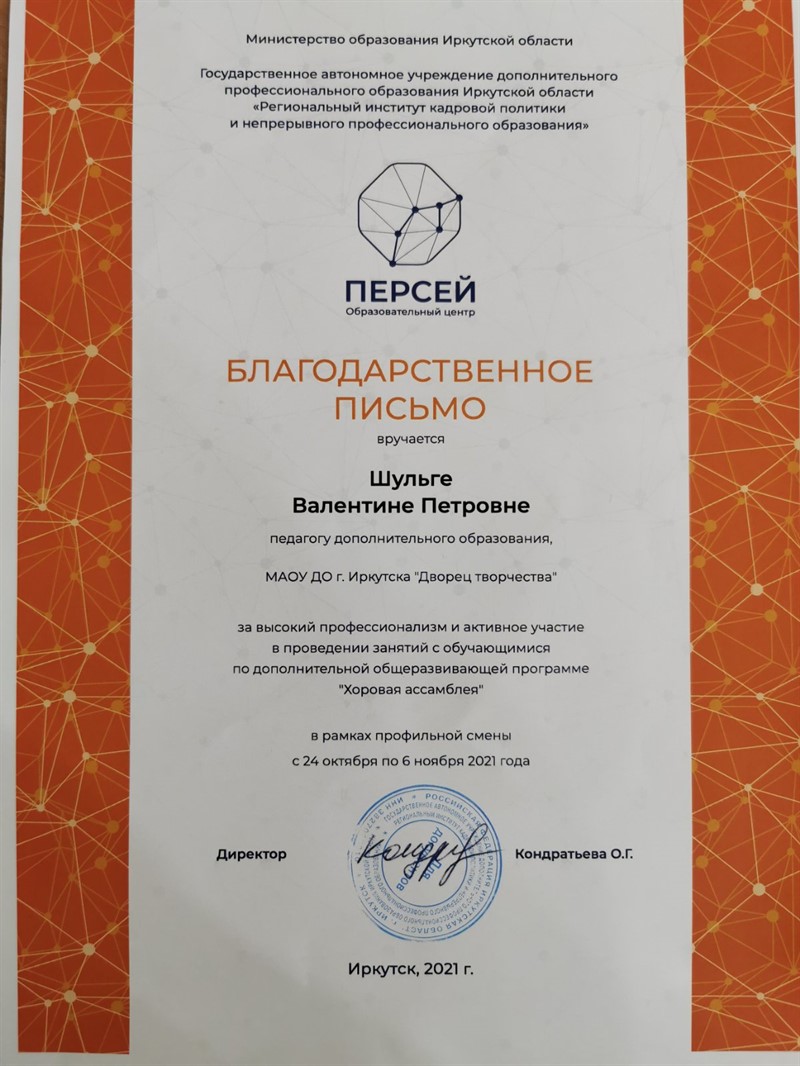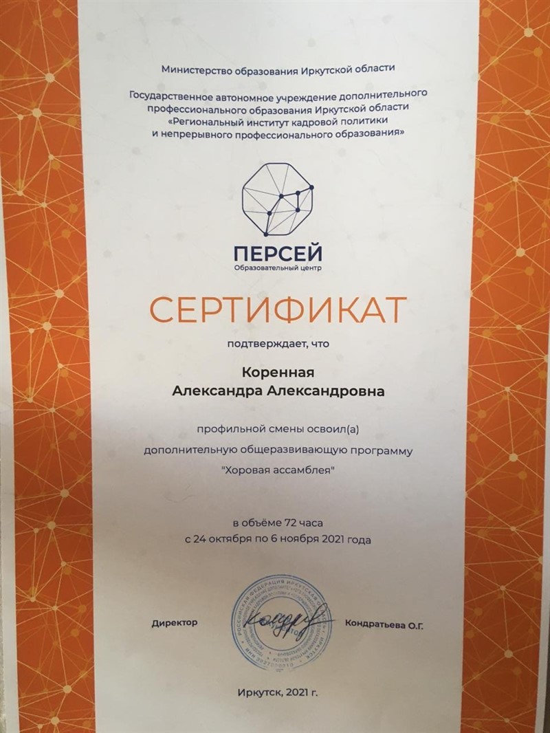 С 25 октября Образовательный центр «Персей» на две недели принял хористов Иркутской области.13 девочек хоровой студии «Ангара» Дворца творчества и руководитель Шульга Валентина Петровна посетили профильную смену. На 14 дней «Персей» превратился о обитель музыки, ведь целью смены было развитие творческого потенциала одаренных детей посредством формы коллективного музицирования, хорового академического исполнительства. Эти две недели для хористов прошли в репетициях и занятиях. Результатом плодотворной работы стал отчетный концерт на сцене Кампуса ОЦ «ПЕРСЕЙ».