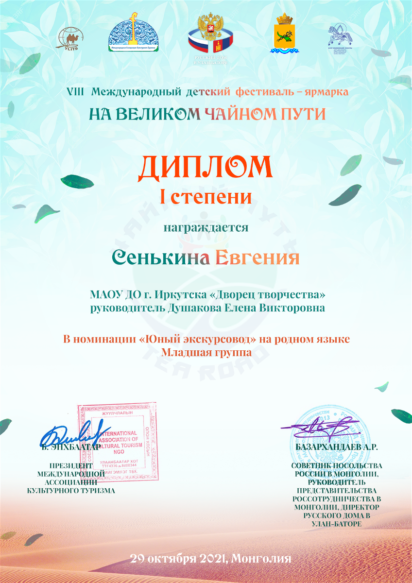 В 2021 году во 2-ом этапе Международного фестиваля-ярмарки в конкурсе «Народная дипломатия на Великом Чайном пути», номинация «Юный экскурсовод», приняла участие Сенькова Евгения, учащаяся творческого объединения «Я – Иркутянин» МАОУ ДО г. Иркутска «Дворец творчества» и заняла I место в своей возрастной категории.