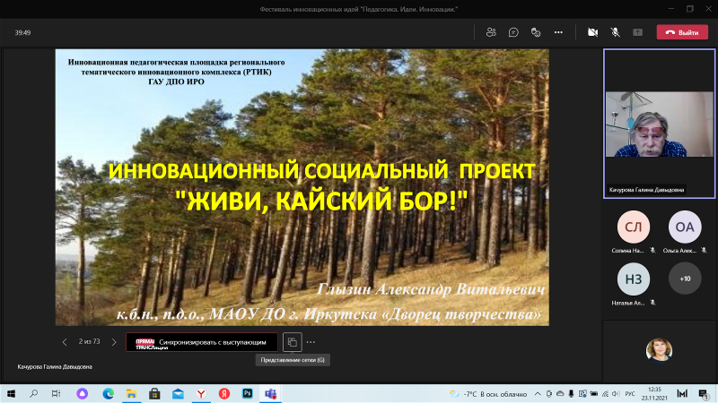 Глызин Александр Витальевич представил результаты реализации проекта «Живи, Кайский бор!». Данный проект – это образовательная, воспитательная, исследовательская, природоохранная, оздоровительная площадка. Экологическое образование и воспитание учащихся является в настоящее время одним из приоритетных направлений работы с молодежью. К реализации данного проекта привлекались социальные партнёры: Министерство природных ресурсов и экологии Иркутской области, Служба по охране природы и озера Байкал, Комитет городского обустройства администрации города Иркутска, Комитет по управлению Свердловским округом, Курорт "Ангара", Российский студенческий отряд. Учащиеся творческих объединений Дворца творчества могут принять активное участие в его реализации.