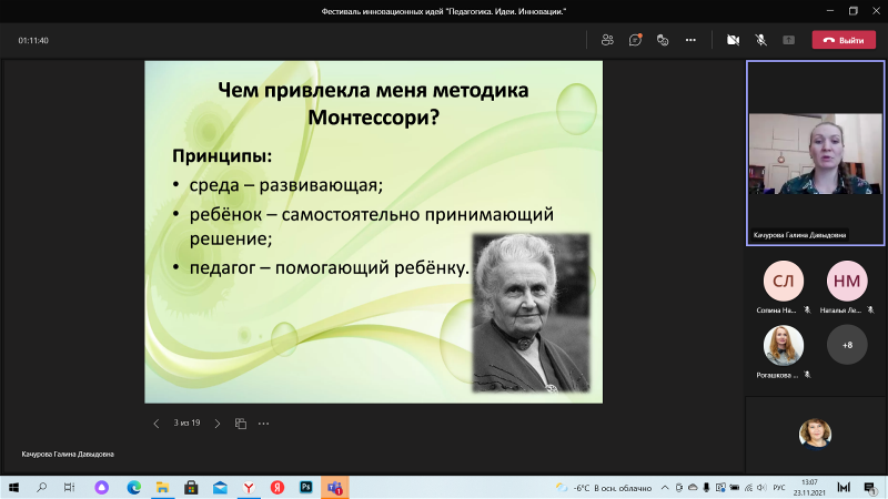 Кормадонова Мария Андреевна представила идеи использования методики Марии Монтессори при обучении детей с ограниченными возможностями здоровья. Каждому ребенку от природы дано быть умным и успешным человеком. Задача взрослых – просто помочь малышу раскрыть свой потенциал, научить его самостоятельно постигать мир. Для этого очень важно создать среду, в которой ребенок сможет и захочет проявить свои индивидуальные способности, будет развиваться и обучаться в собственном ритме. Такую возможность предоставляет нам педагогика итальянского психолога Марии Монтессори. Каждый педагог Дворца творчества может применить основные идеи Марии Монтессори при создании развивающей среды для обучения учащихся с учётом их индивидуальных способностей и особенностей.
