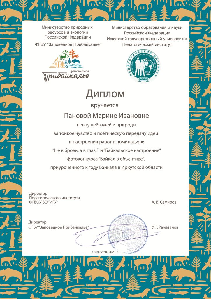 4 февраля ФГБУ «Заповедное Прибайкалье» разместило у себя на сайте виртуальную фото выставку призеров областного конкурса «Байкал в объективе», посвященного Году Байкала в Иркутской области в 2021 году. Организаторами конкурса являлись Иркутский государственный университет при поддержке ФГБУ «Заповедное Прибайкалье». На конкурс было прислано более 400 работ.
